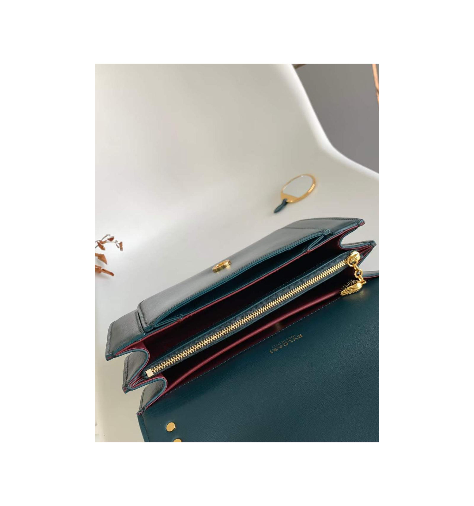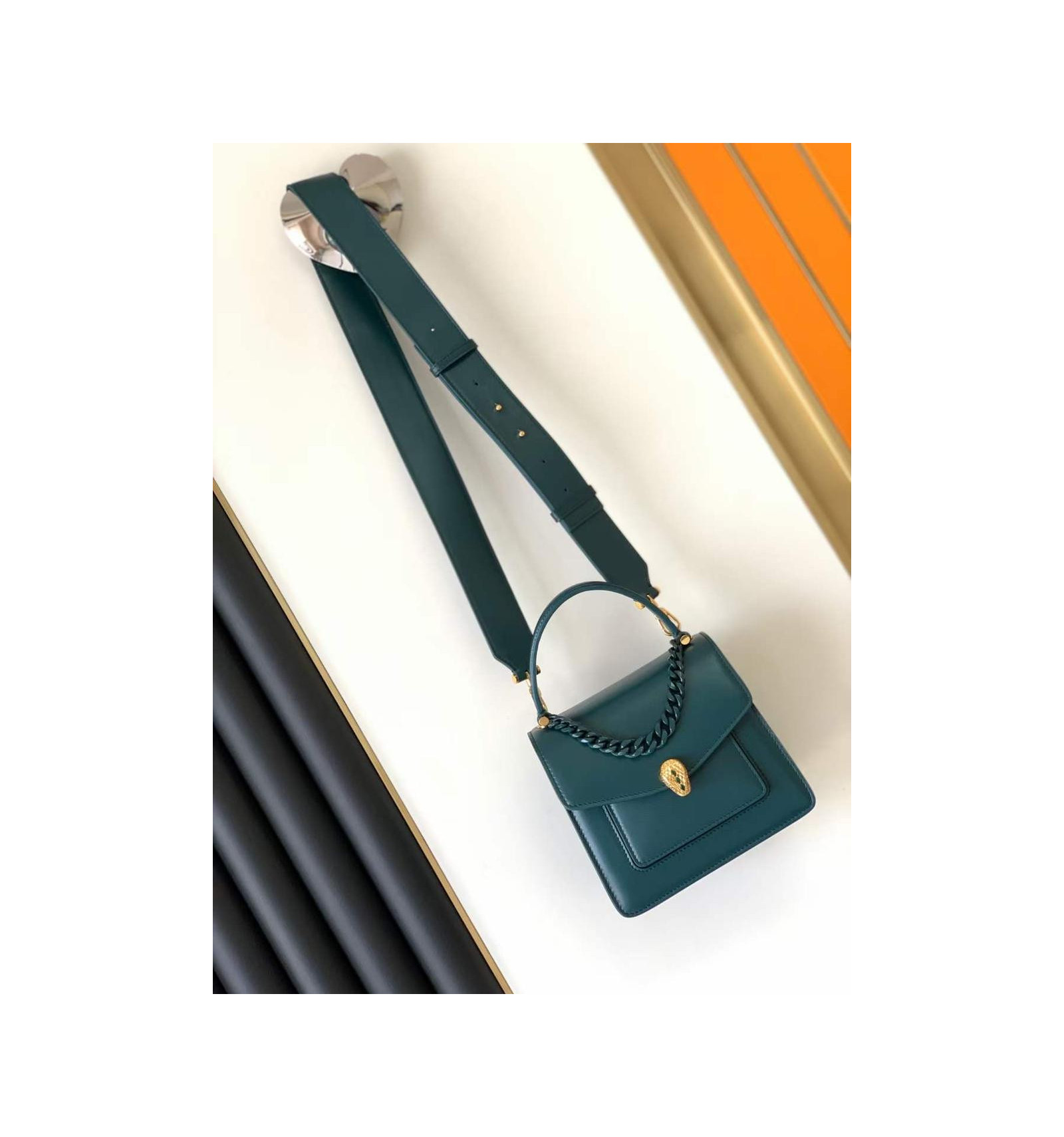 Serpenti Forever miniature bag with charm in azalea quartz green calf leather with beetroot spinel fuchsia calf leather interior. Captivating snakehead press stud closure in light gold-plated brass, embellished with green and white agate enamel scales and black enamel eyes.