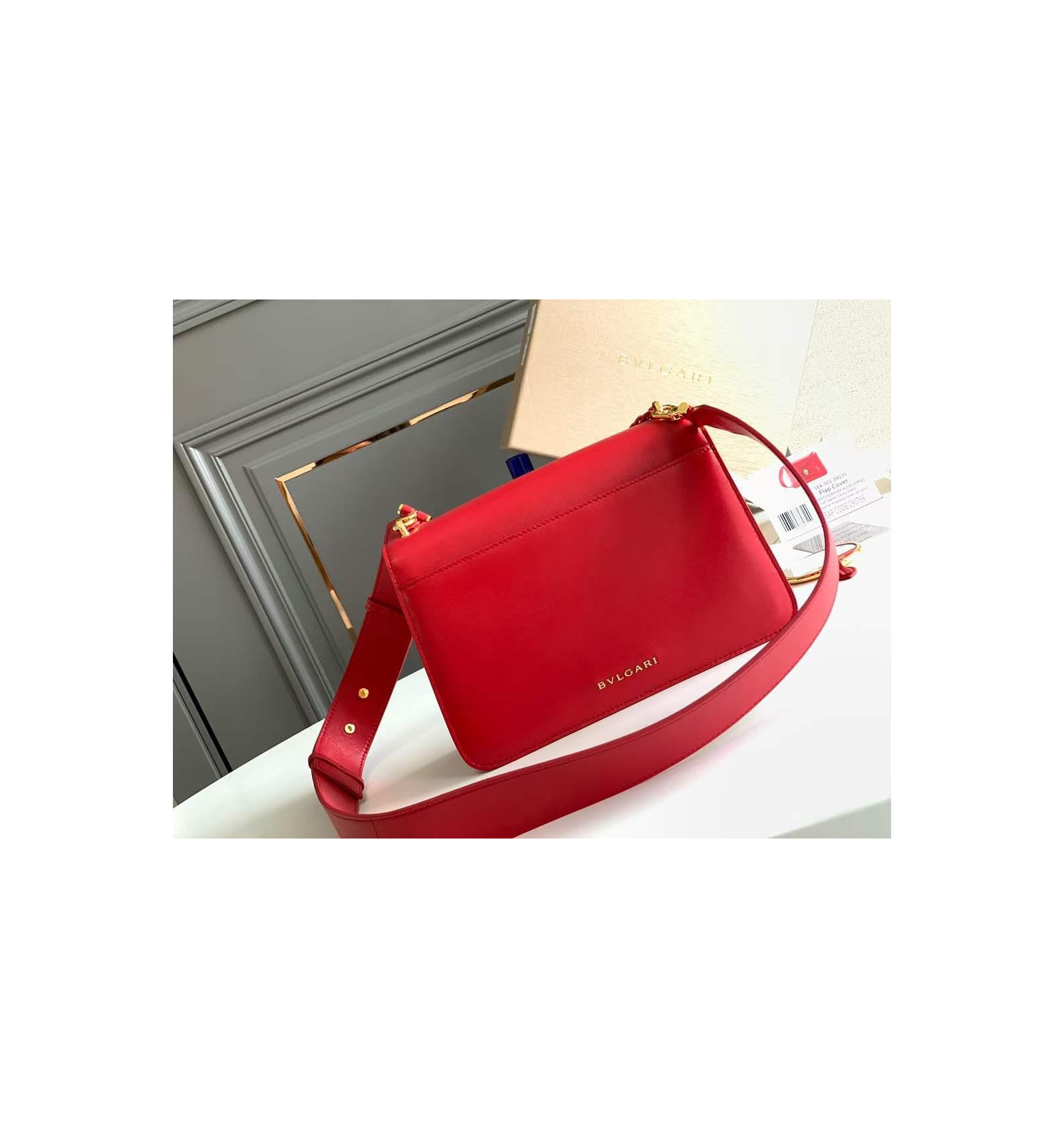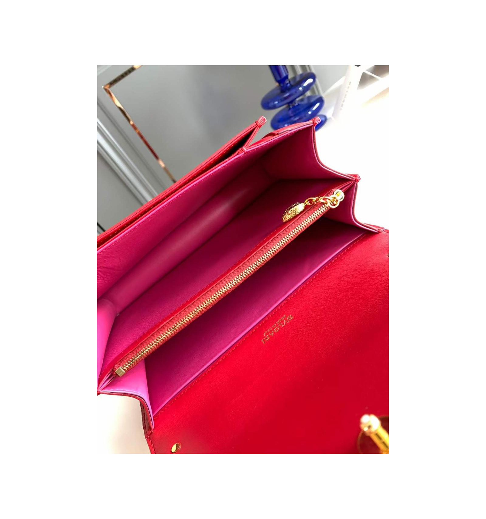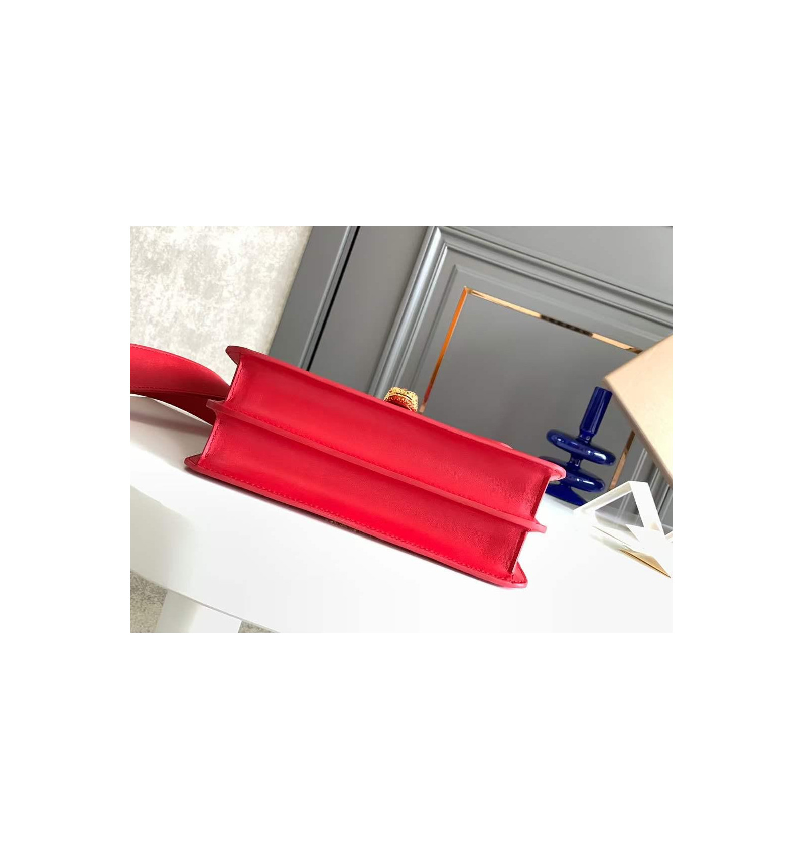 Serpenti Forever miniature bag with charm in azalea quartz red calf leather with beetroot spinel fuchsia calf leather interior. Captivating snakehead press stud closure in light gold-plated brass, embellished with red and white agate enamel scales and black enamel eyes.