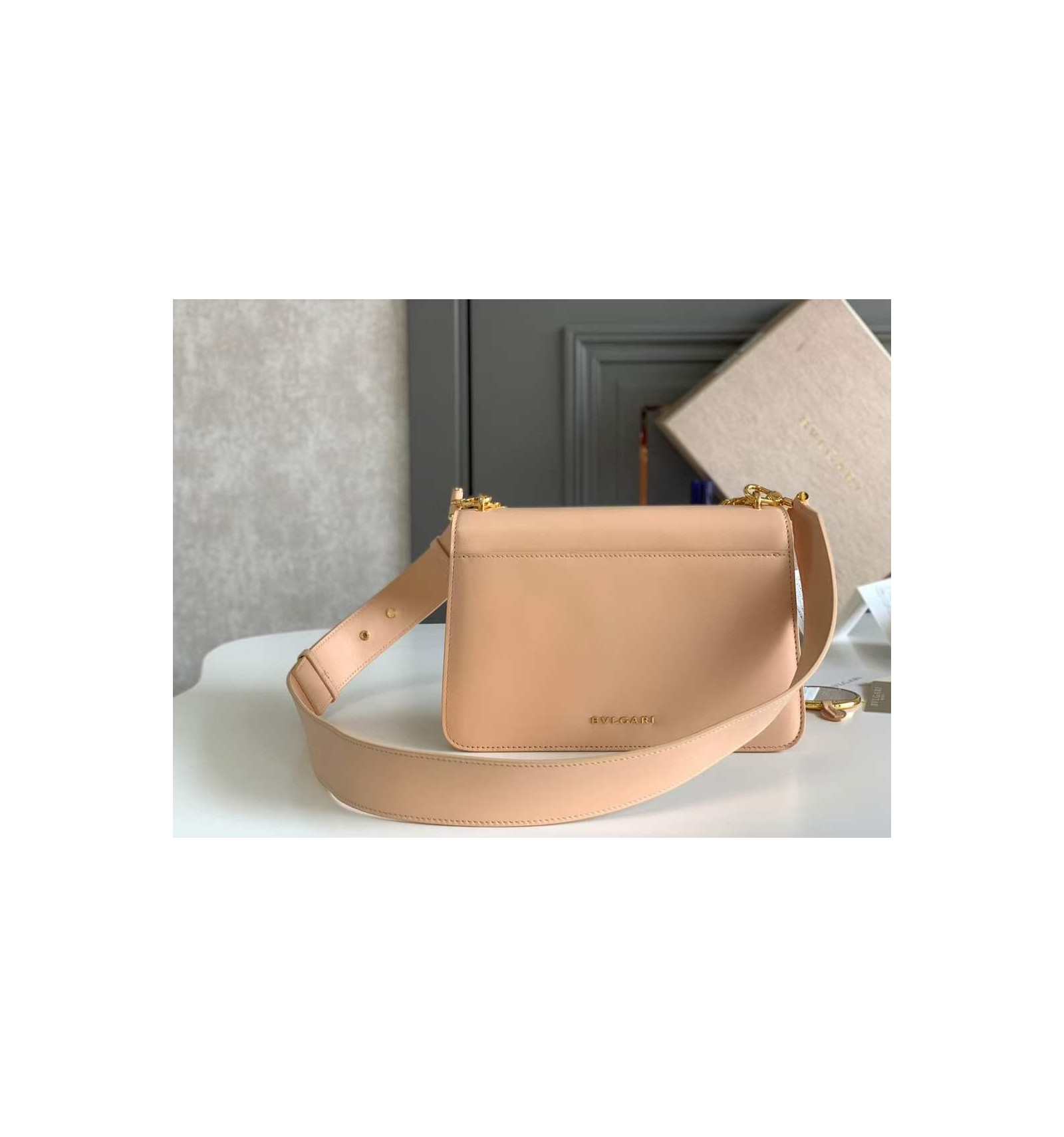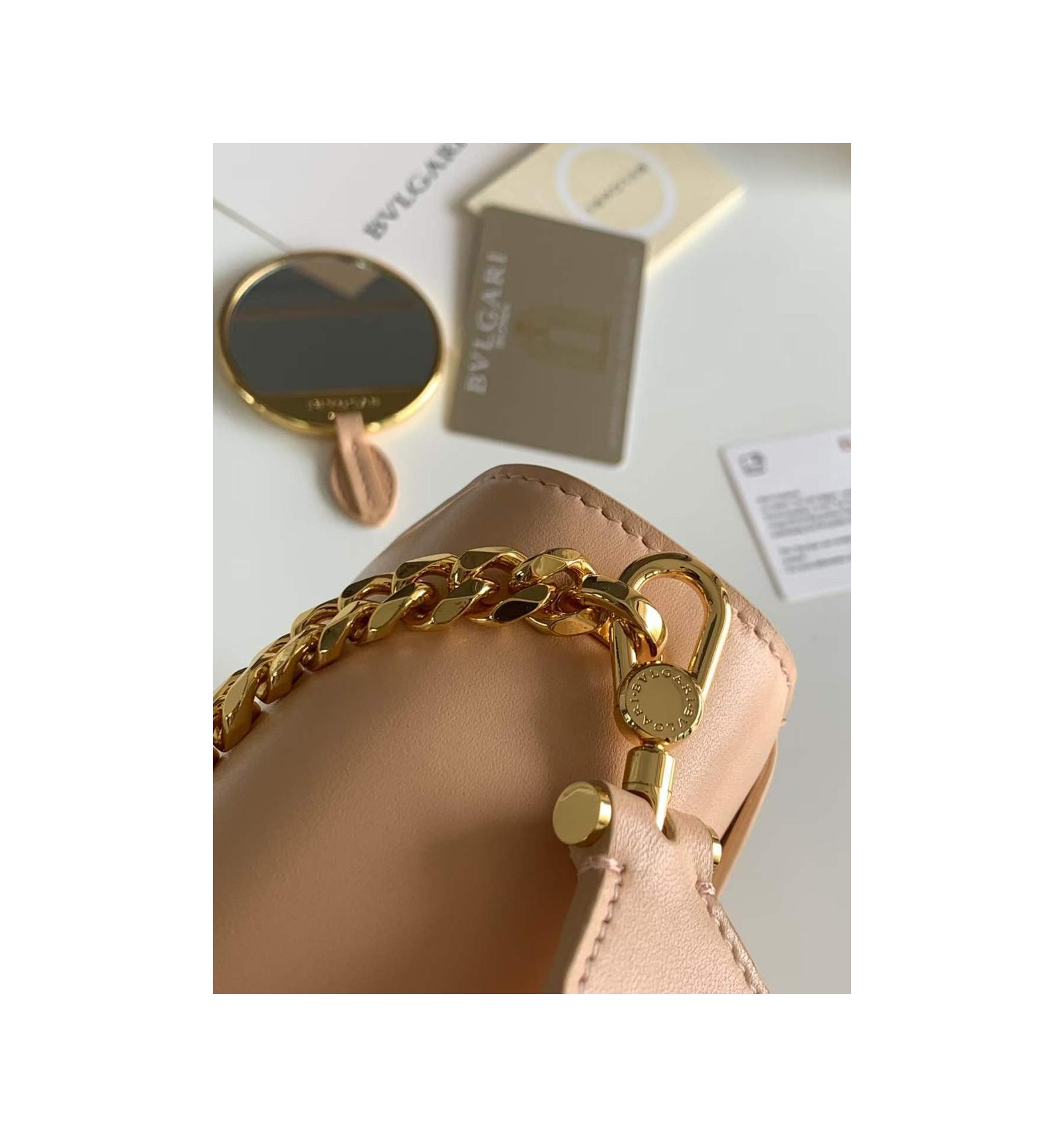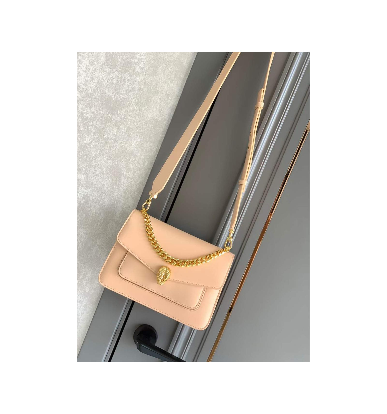 Serpenti Forever miniature bag with charm in azalea quartz beige calf leather with beetroot spinel fuchsia calf leather interior. Captivating snakehead press stud closure in light gold-plated brass, embellished with beige and white agate enamel scales and black enamel eyes.