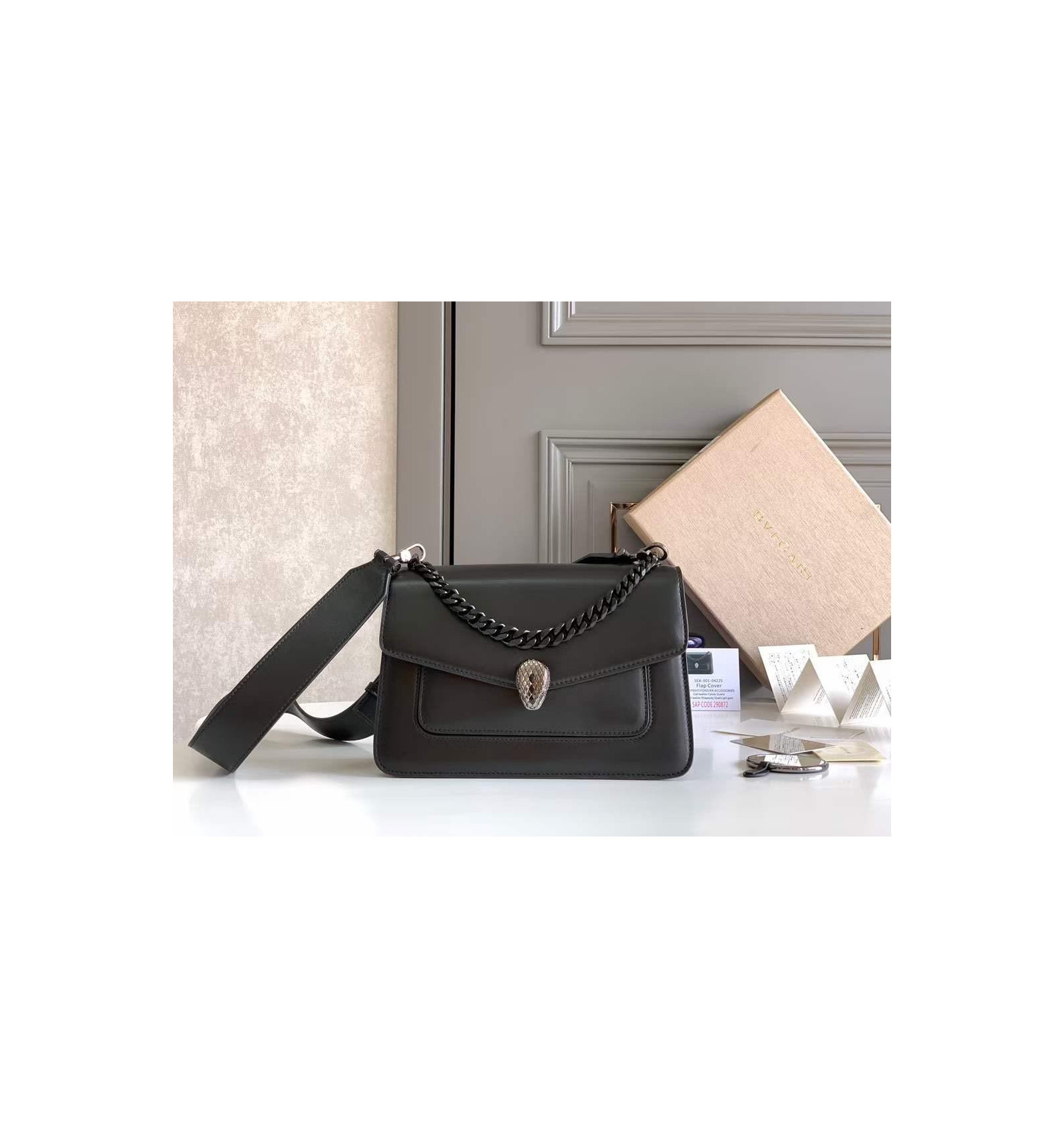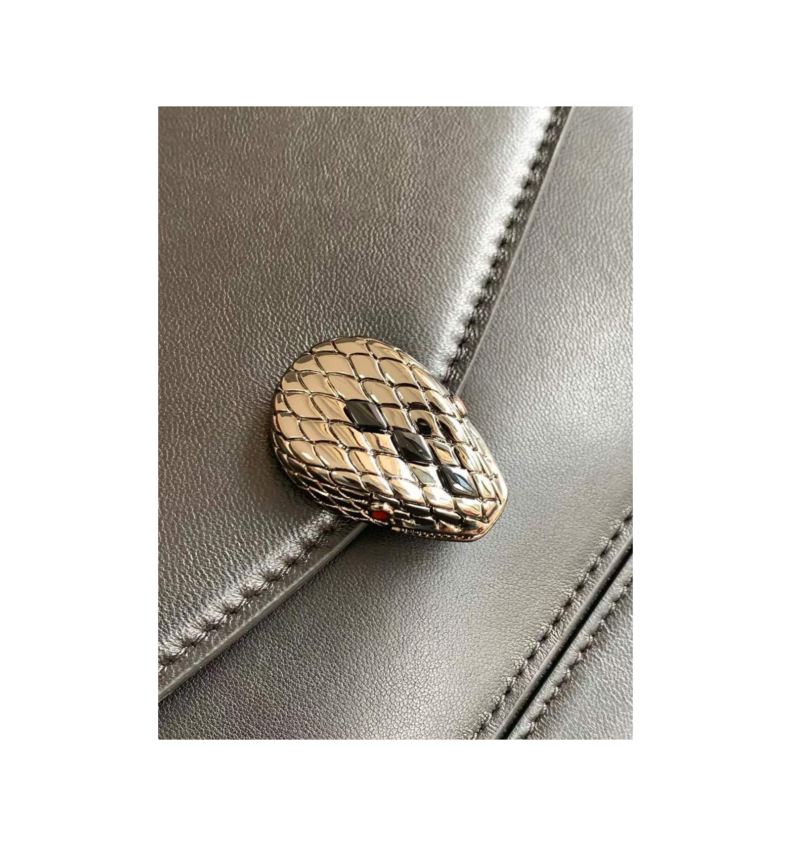 Serpenti Forever miniature bag with charm in azalea quartz black calf leather with beetroot spinel fuchsia calf leather interior. Captivating snakehead press stud closure in light gold-plated brass, embellished with black and white agate enamel scales and black enamel eyes.