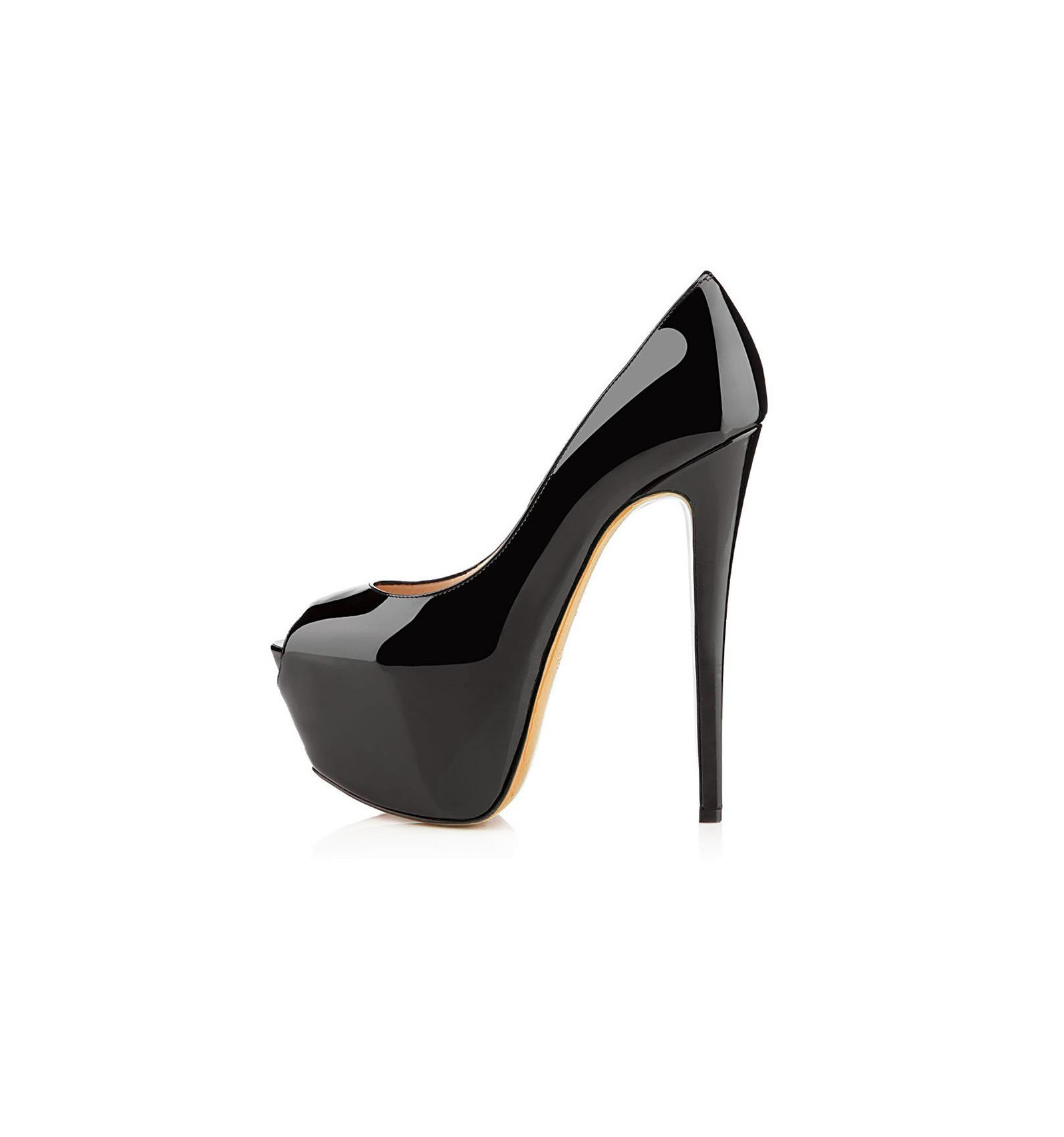 A Louboutin icon, the New Very Privé pump embodies the glamour of 1950s pin-ups and the daring of burlesque. A curved décolleté gently encases the foot, plunging down to a revealing toe cleavage that finishes in a sensual peep toe. The upper is incorporated into a concealed platform and teeters vertiginously over a 120 mm stiletto heel. This season’s offering comes in vampish glossy black patent leather, lined with signature red.