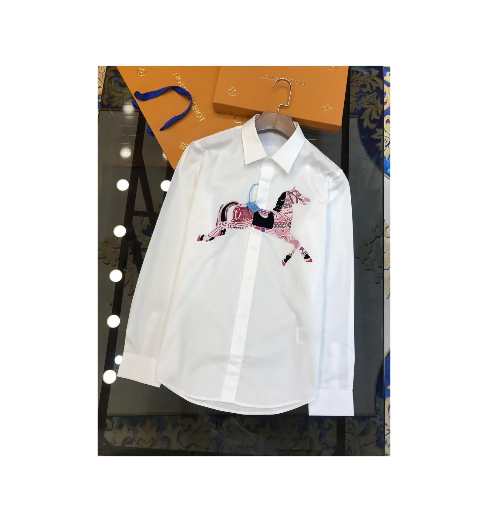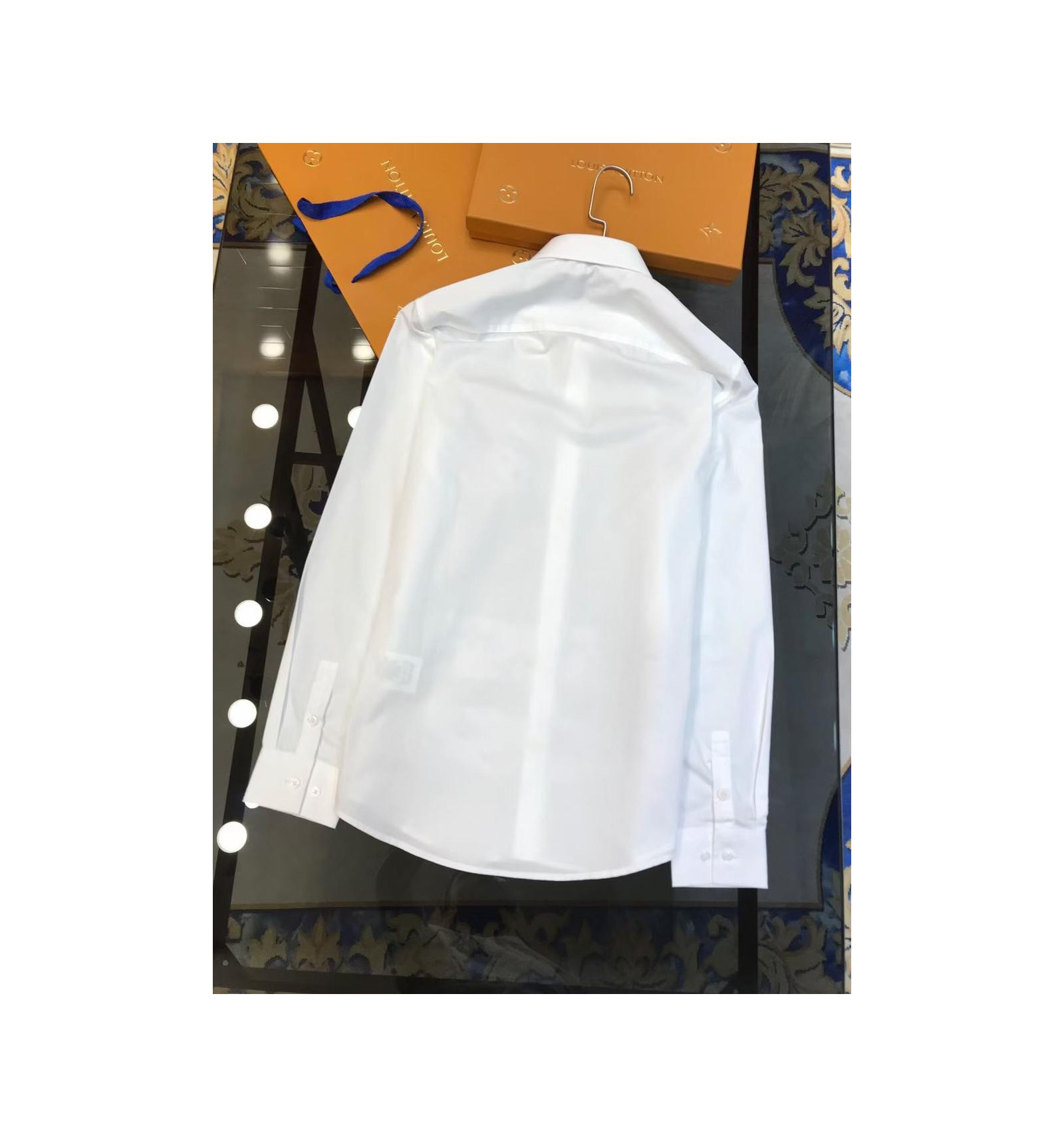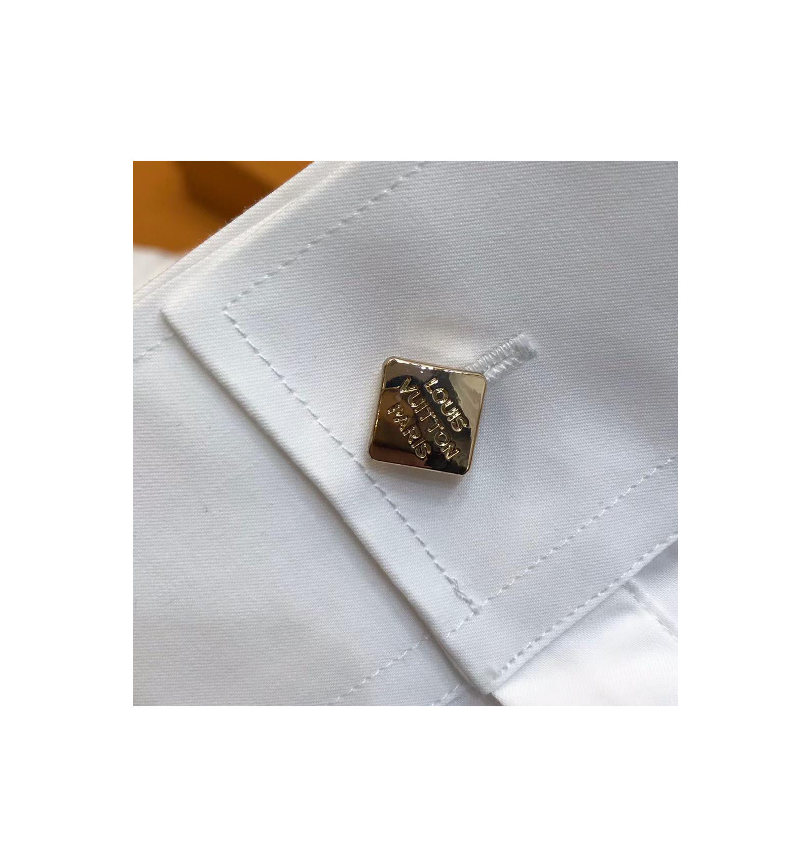 Flared shirt with covered buttons, gold metal buttons at collar and cuffs. Unisex style.