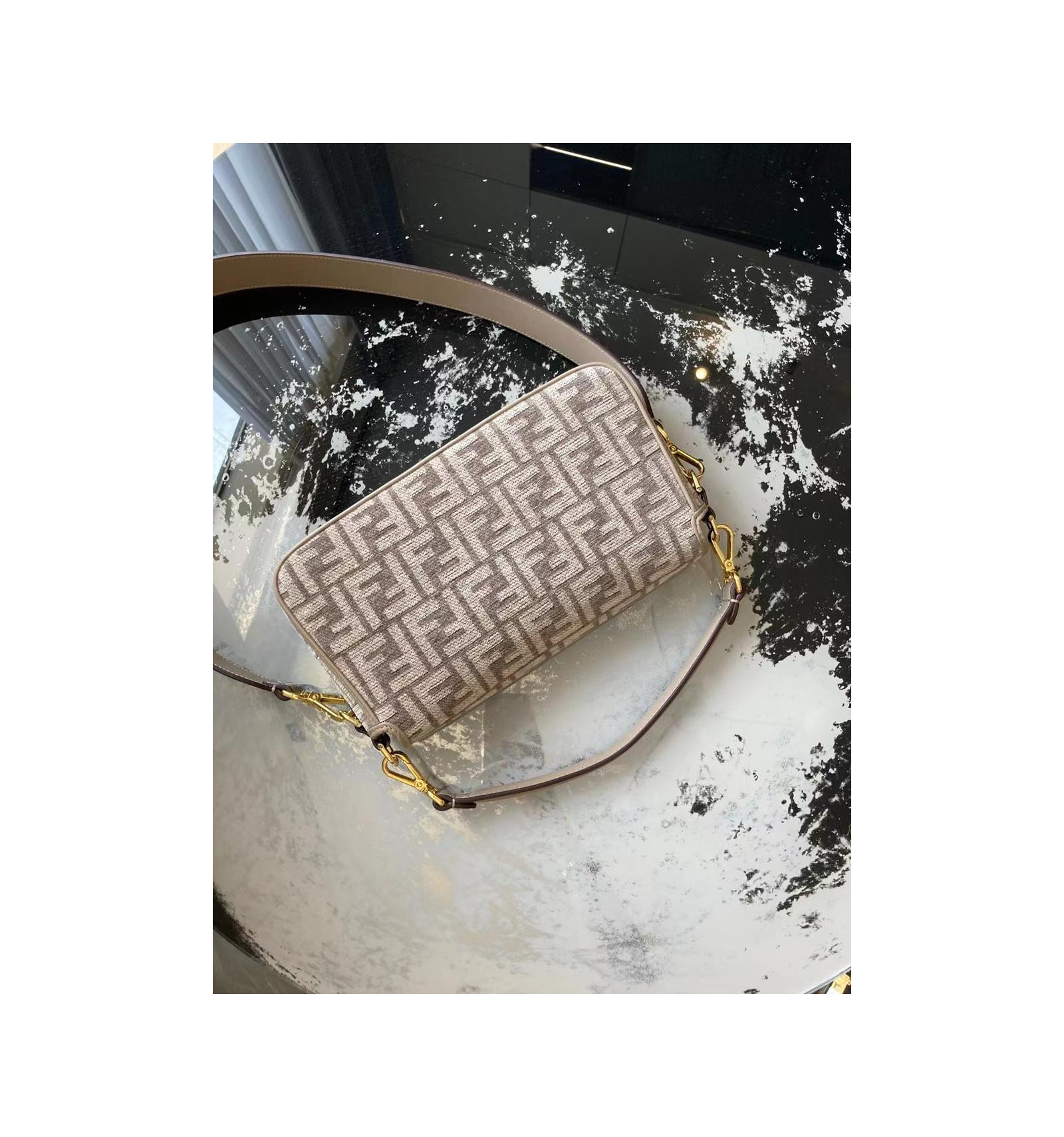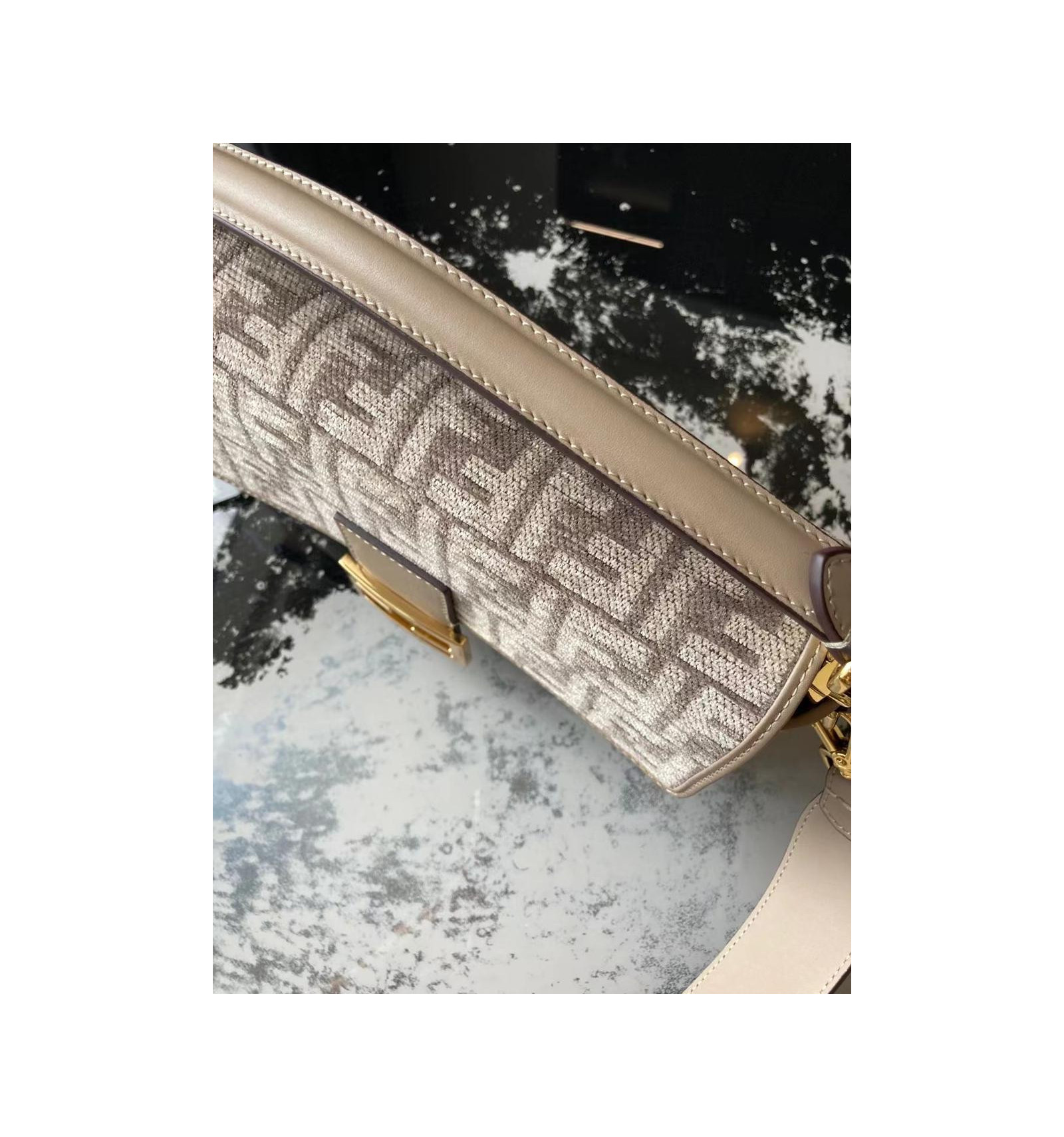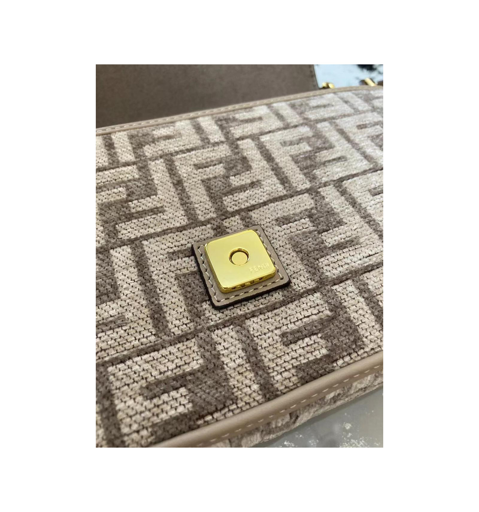 Sac iconique Baguette, format moyen, en chenille avec motif FF tapisserie couleur gris tourterelle. Rehaussé de détails en cuir ton sur ton et d’un fermoir FF.
