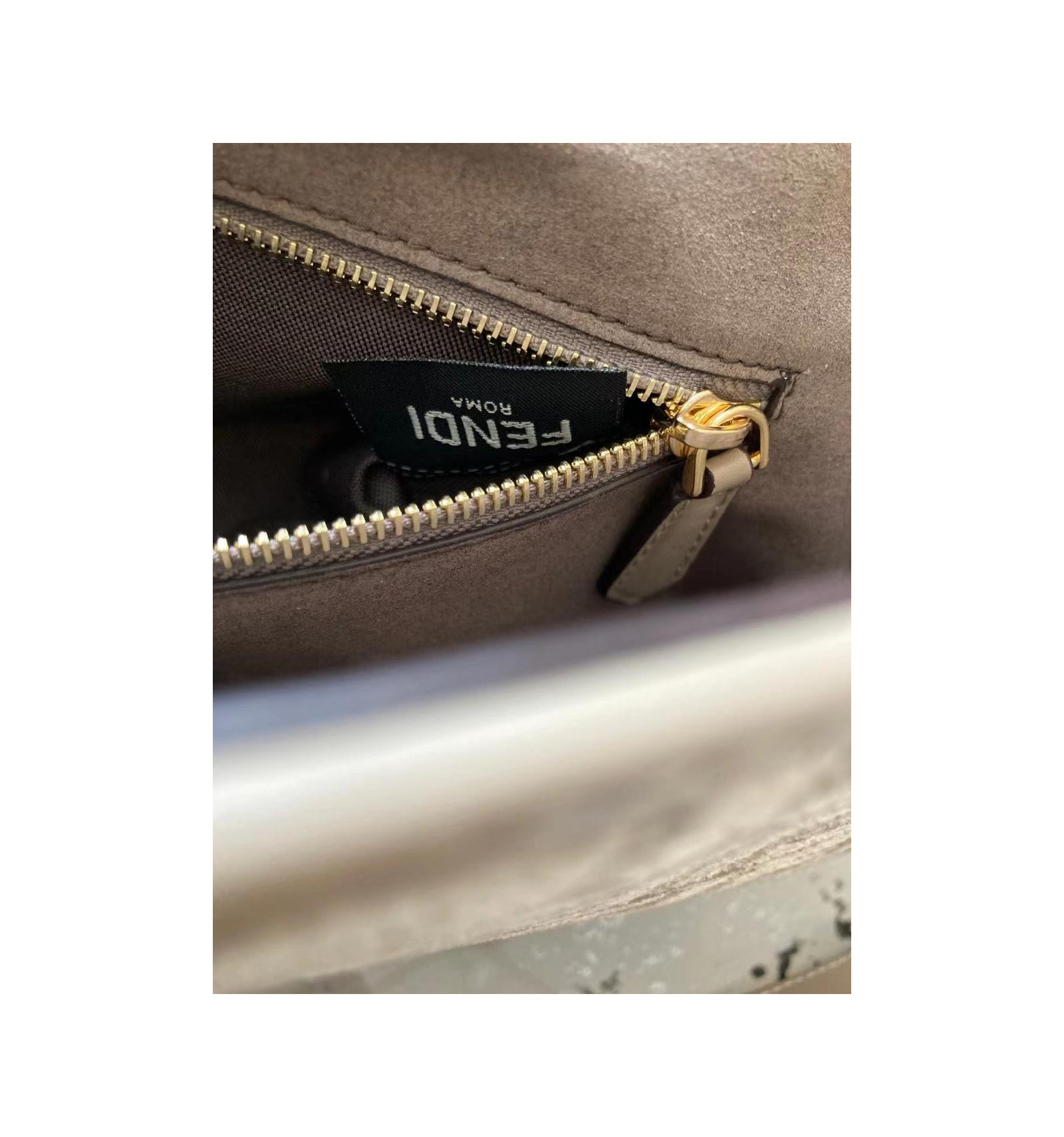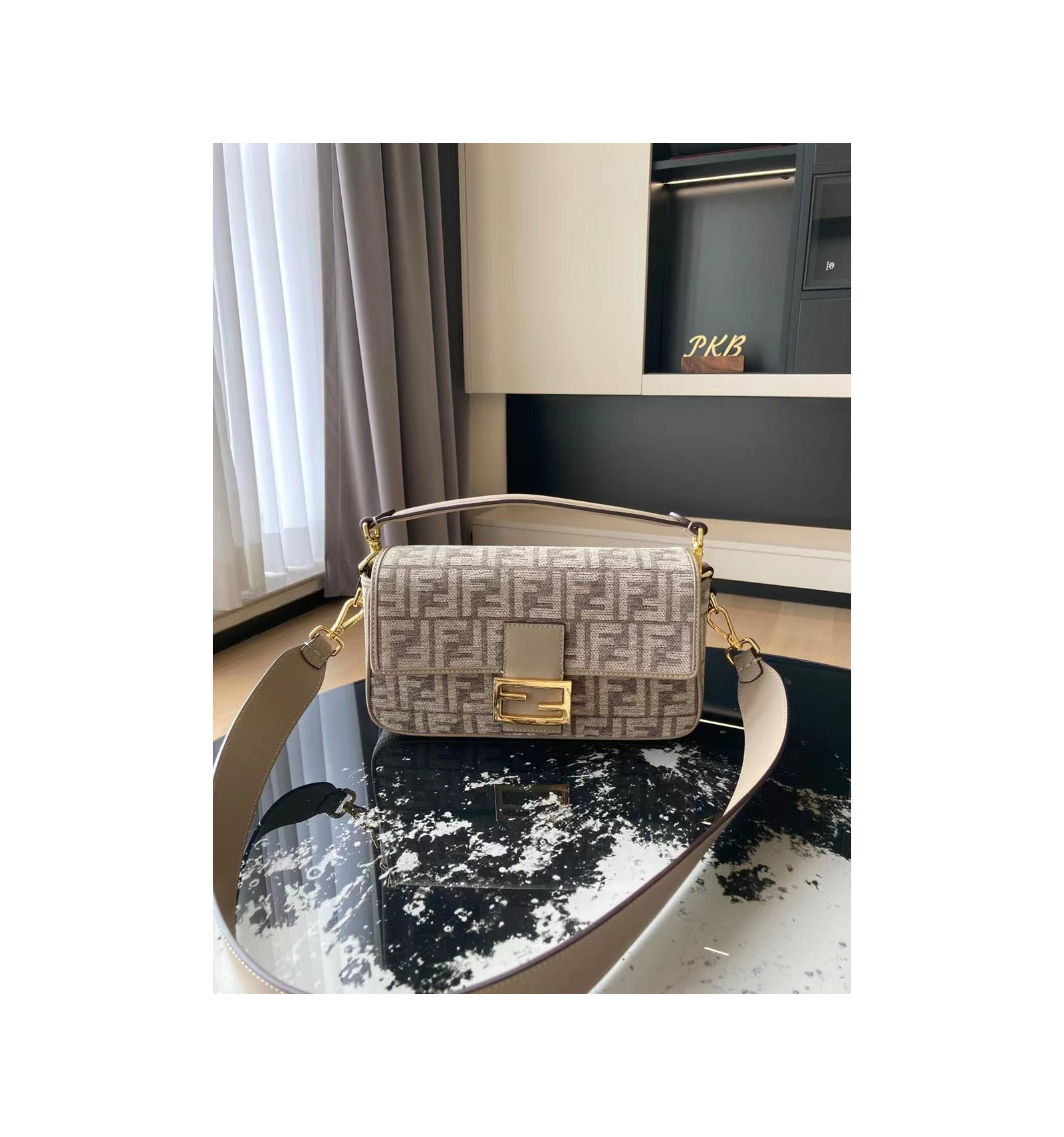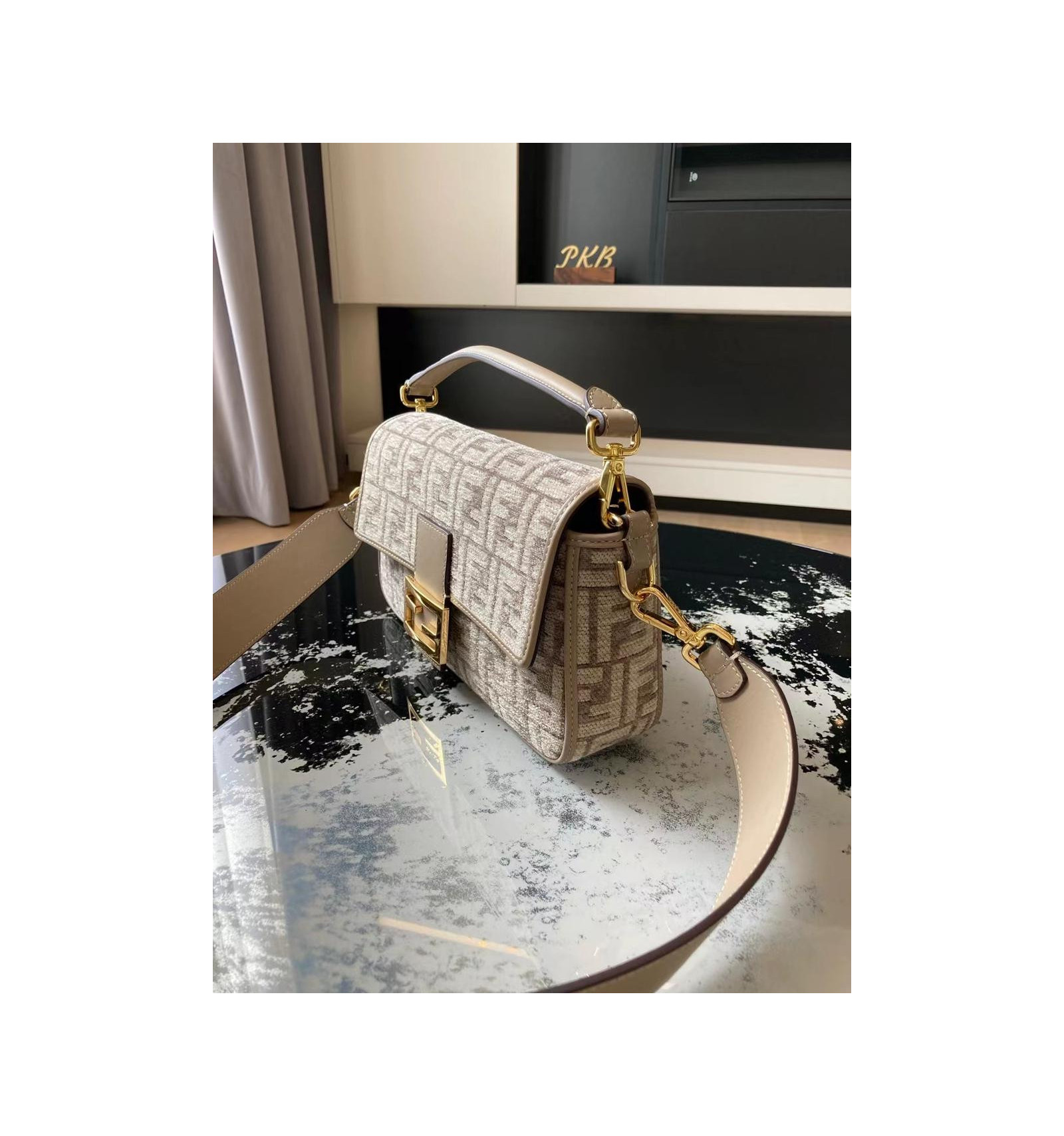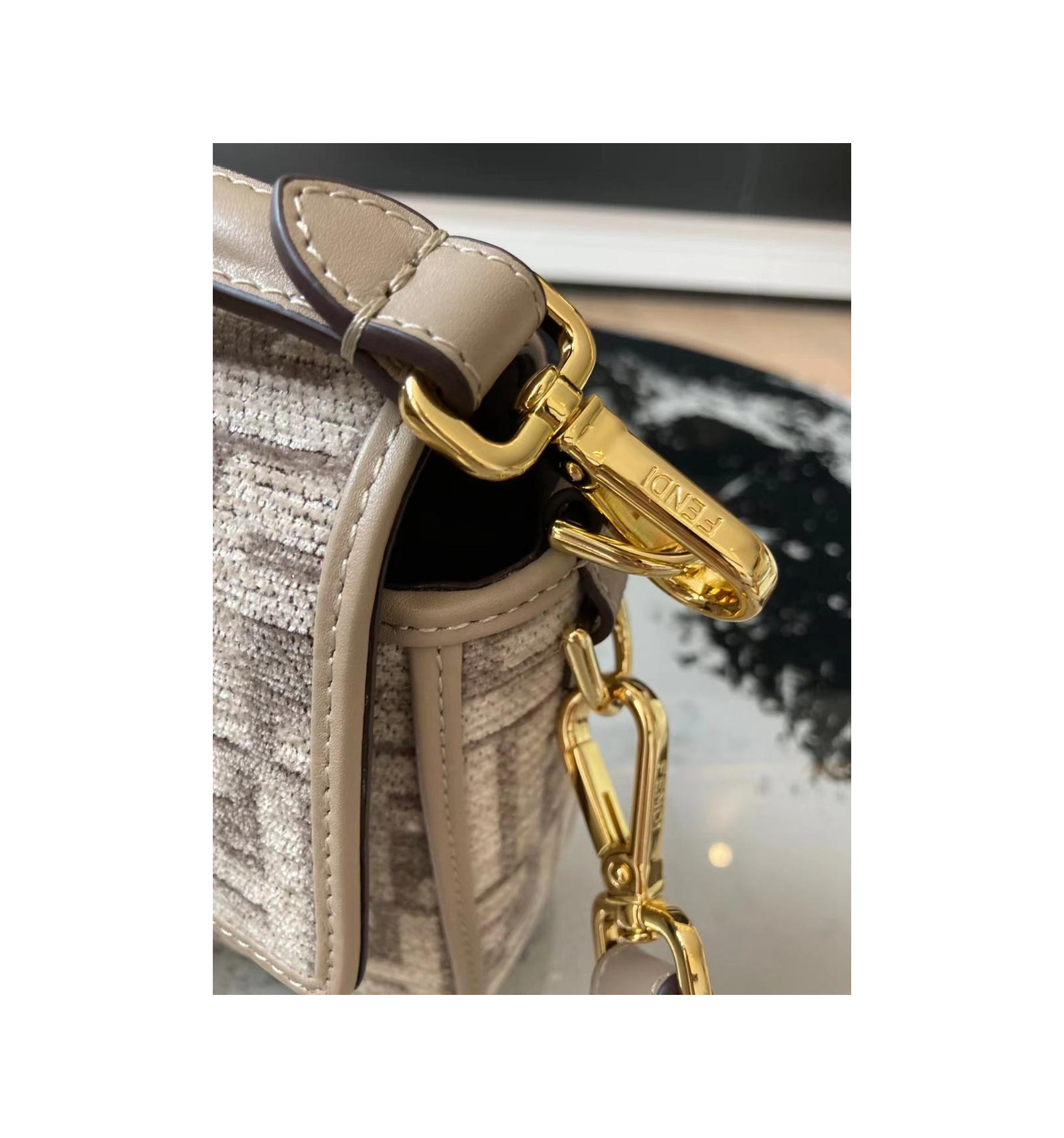 Sac iconique Baguette, format moyen, en chenille avec motif FF tapisserie couleur gris tourterelle. Rehaussé de détails en cuir ton sur ton et d’un fermoir FF.