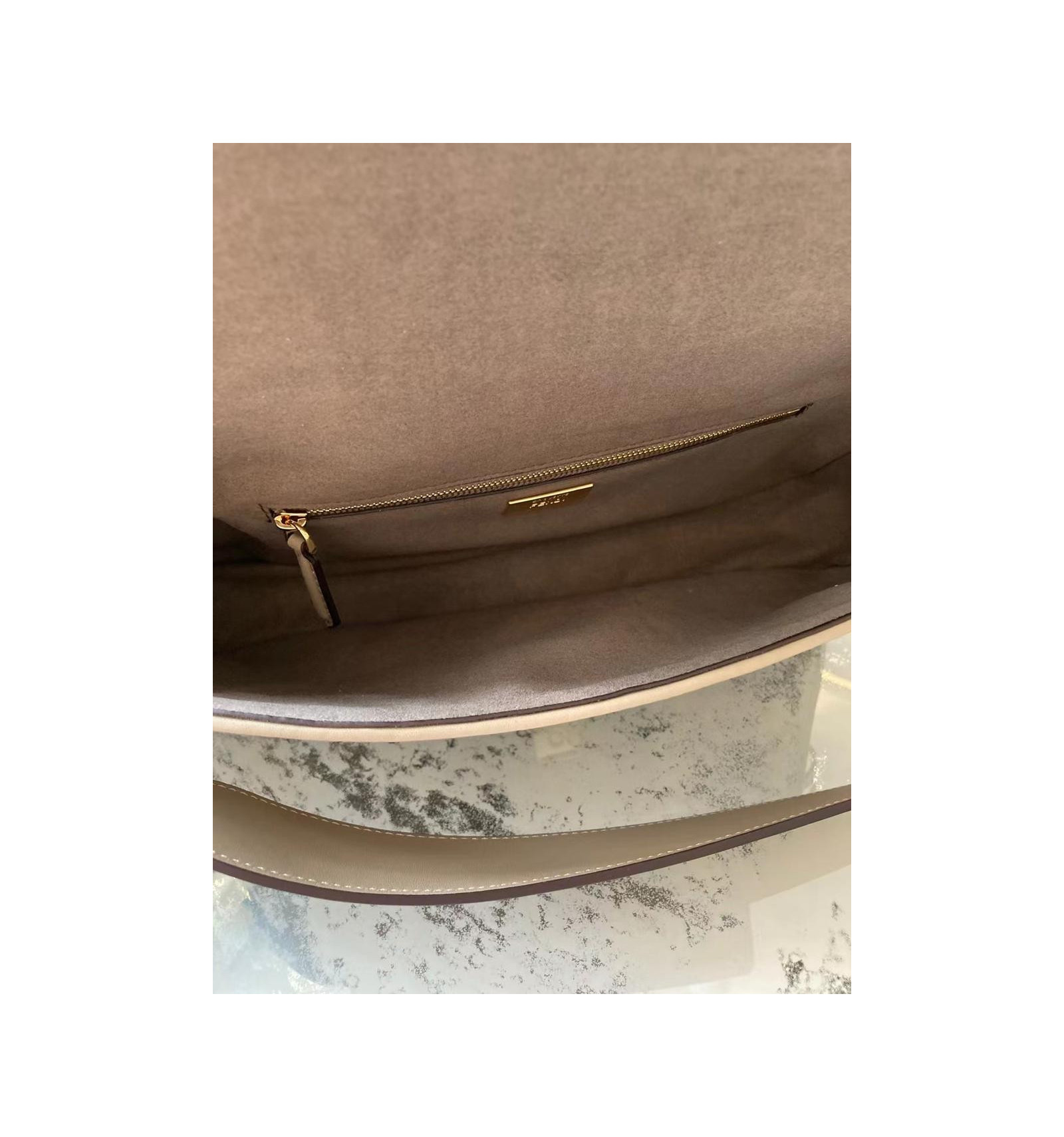 Le sac présente un rabat à l’avant, une fermeture par bouton aimanté, un compartiment intérieur doublé en tissu suédé avec une poche zippée et des accessoires en métal finition or vintage.