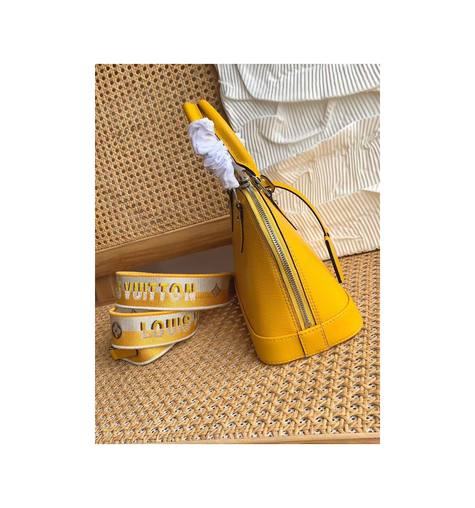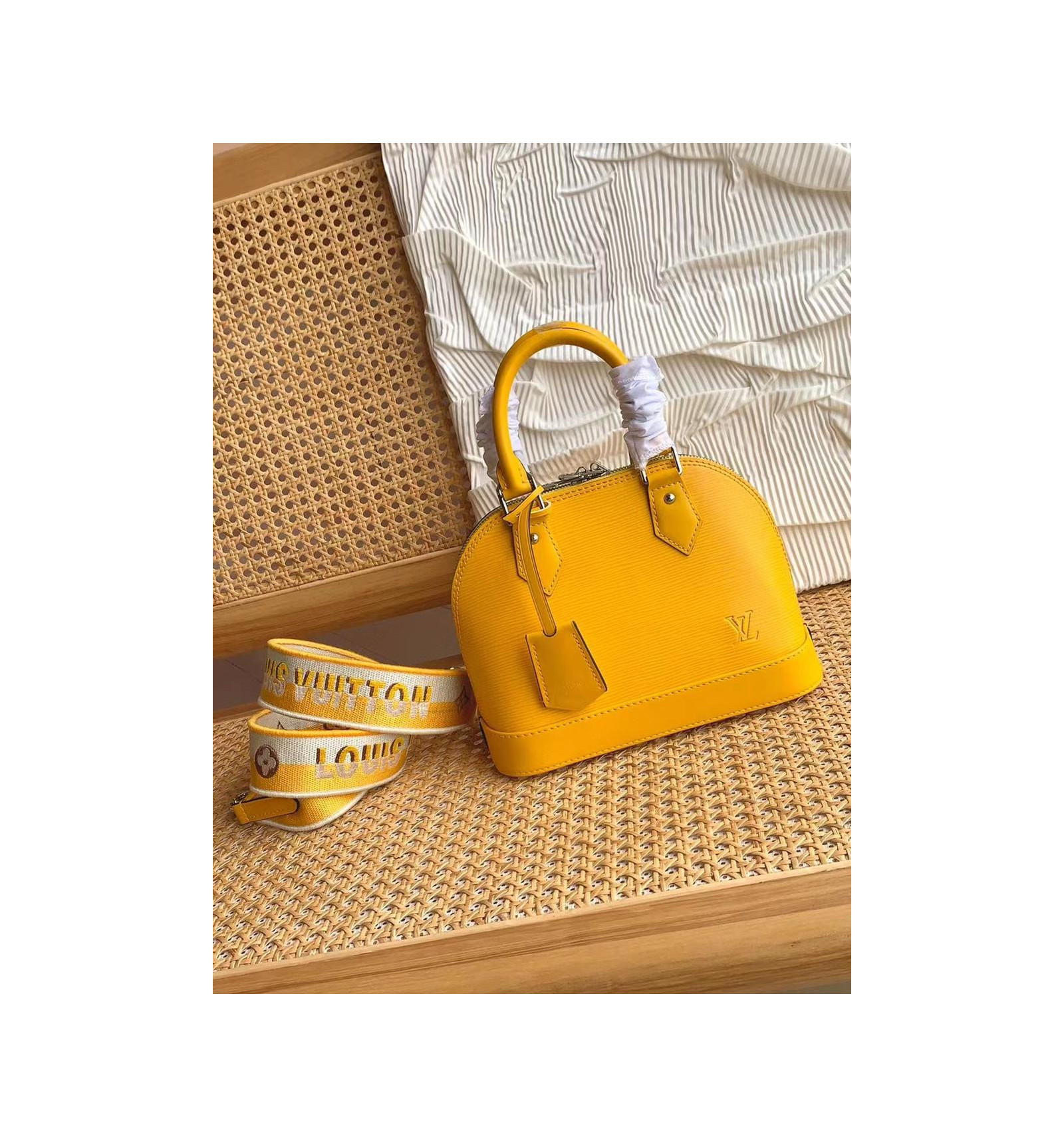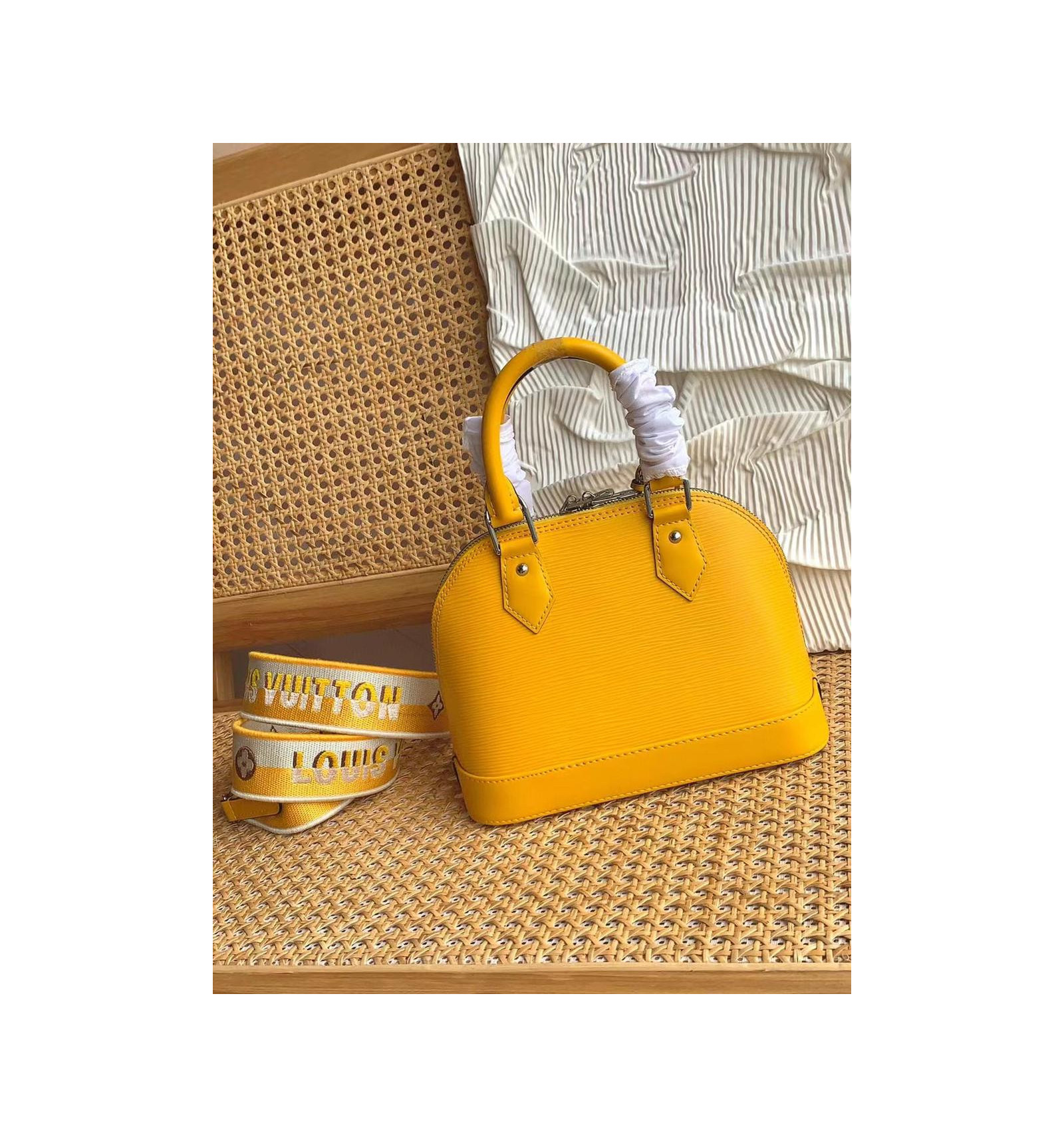 The Alma BB handbag, with its Art Deco shape and heritage details such as the key bell, is crafted from the House’s emblematic Epi grained leather. In addition to its hand-stitched, rolled-leather top handles, this version comes with a removable shoulder strap, signed with the words “Louis Vuitton”, for shoulder or cross-body carry.