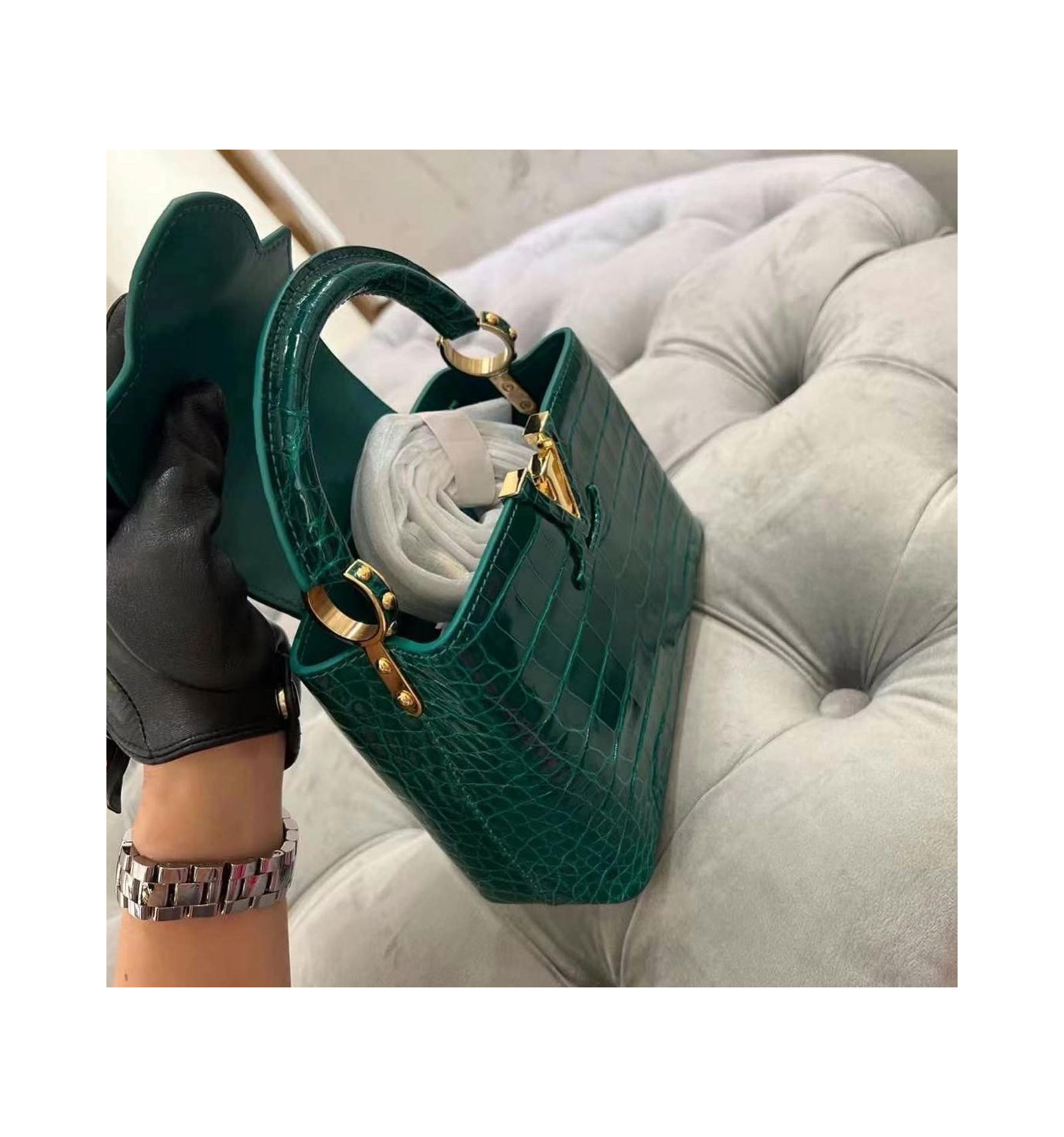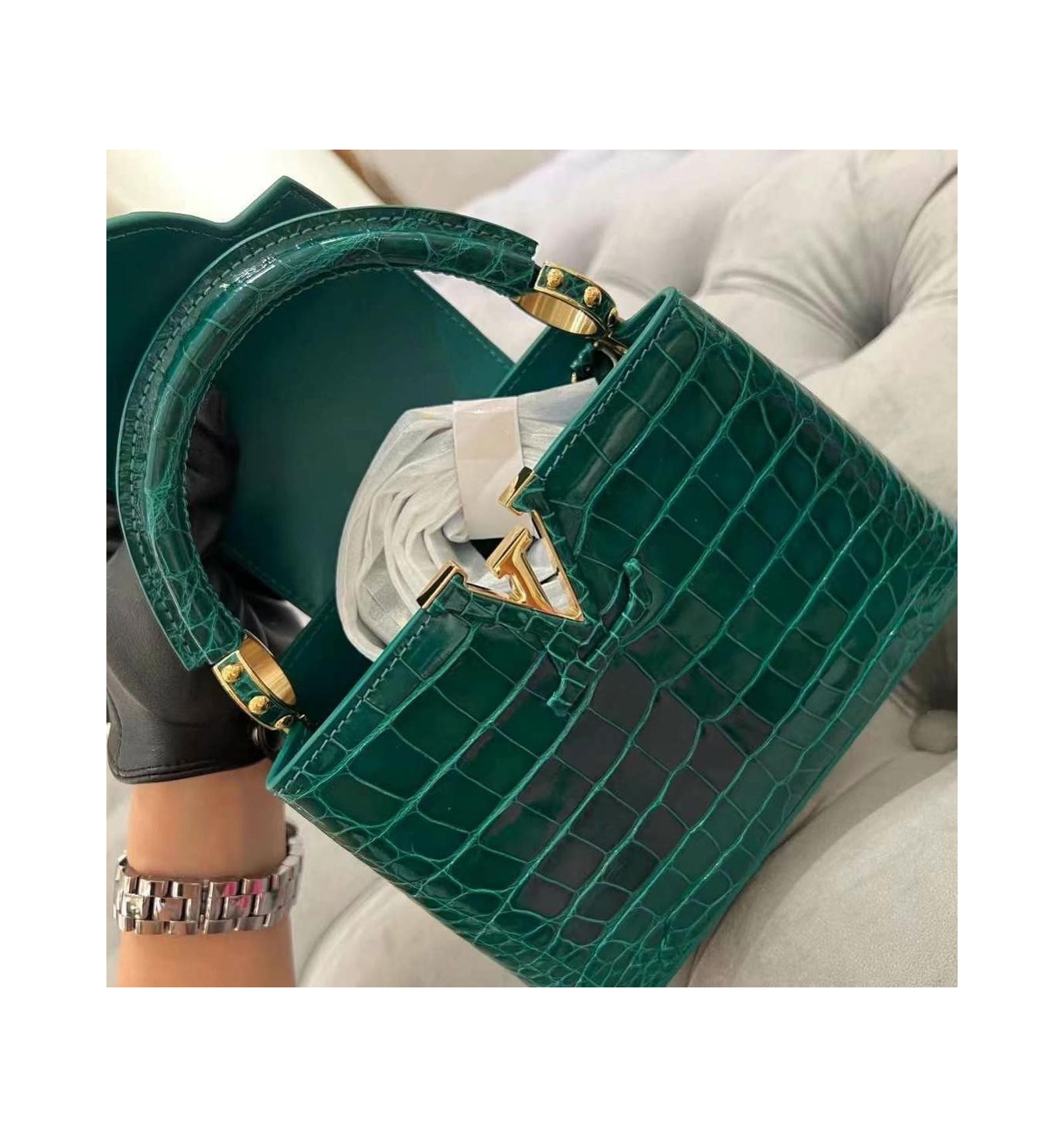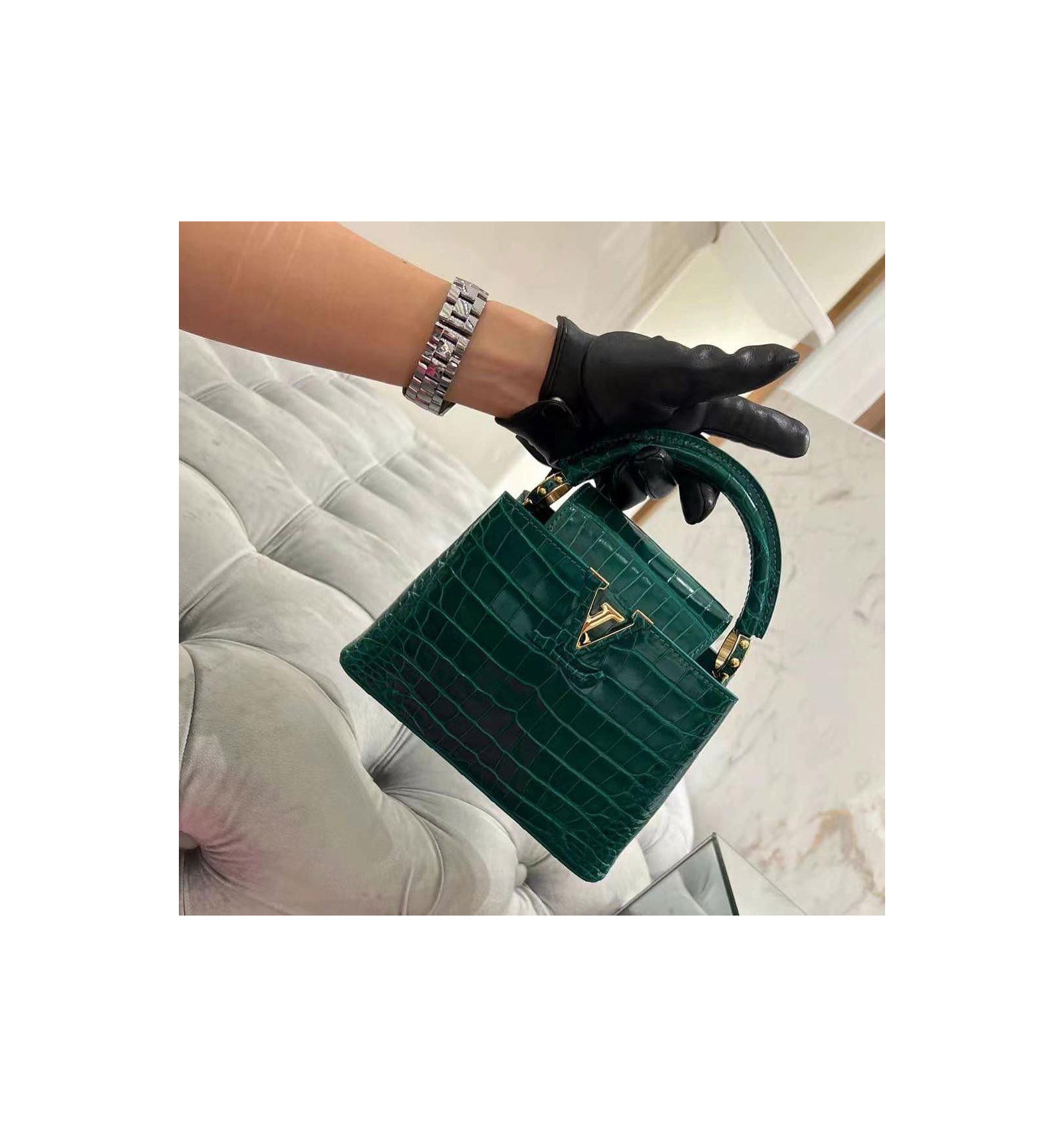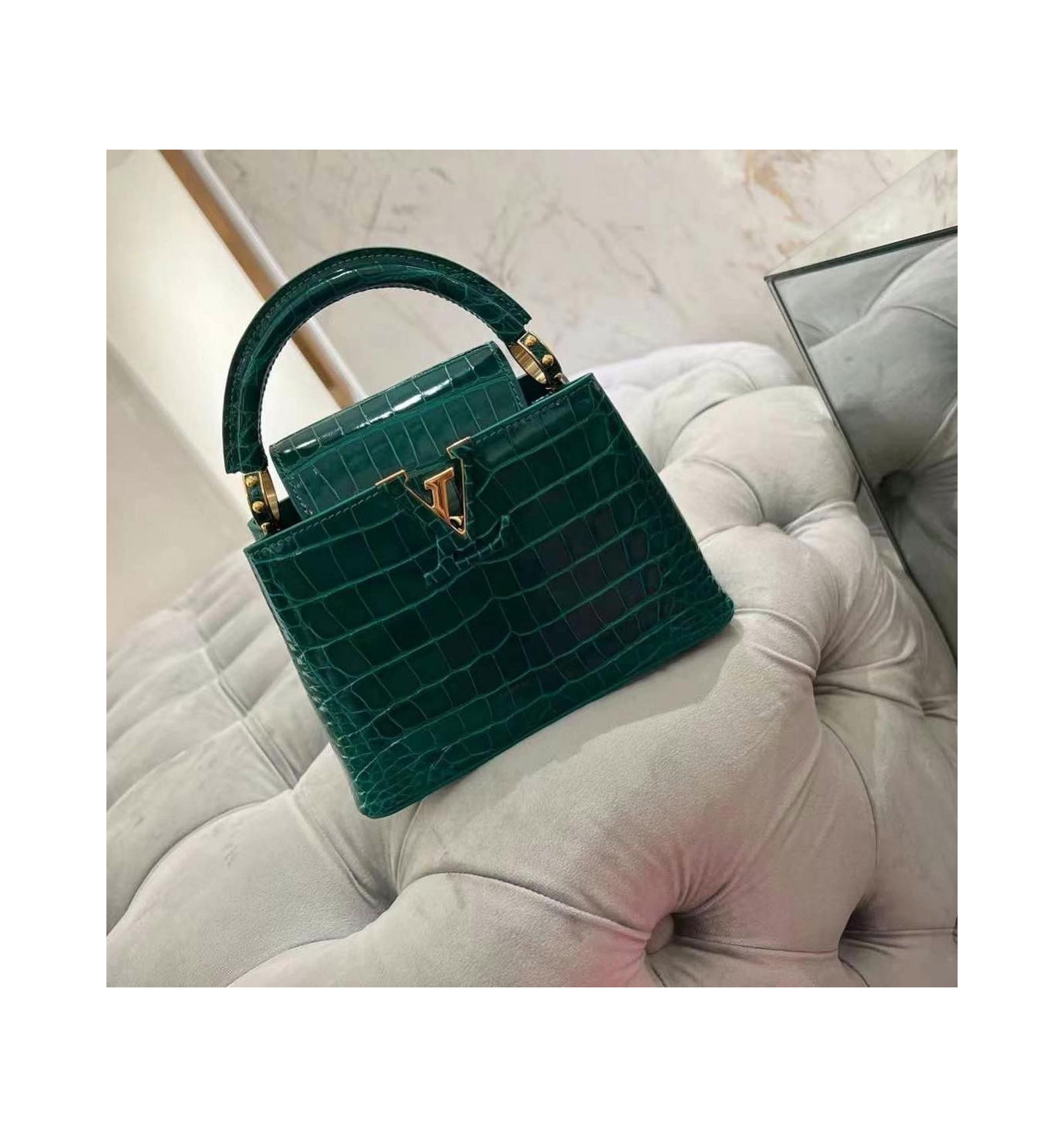 This Capucines BB will elevate any silhouette. The precious crocodilian leather is polished to a high gloss, set off by gleaming metal hardware. Lined with goatskin and fitted with a removable strap for shoulder or cross-body wear, this glamorous bag displays the emblematic design and signature details that make the Capucines a New Classic.