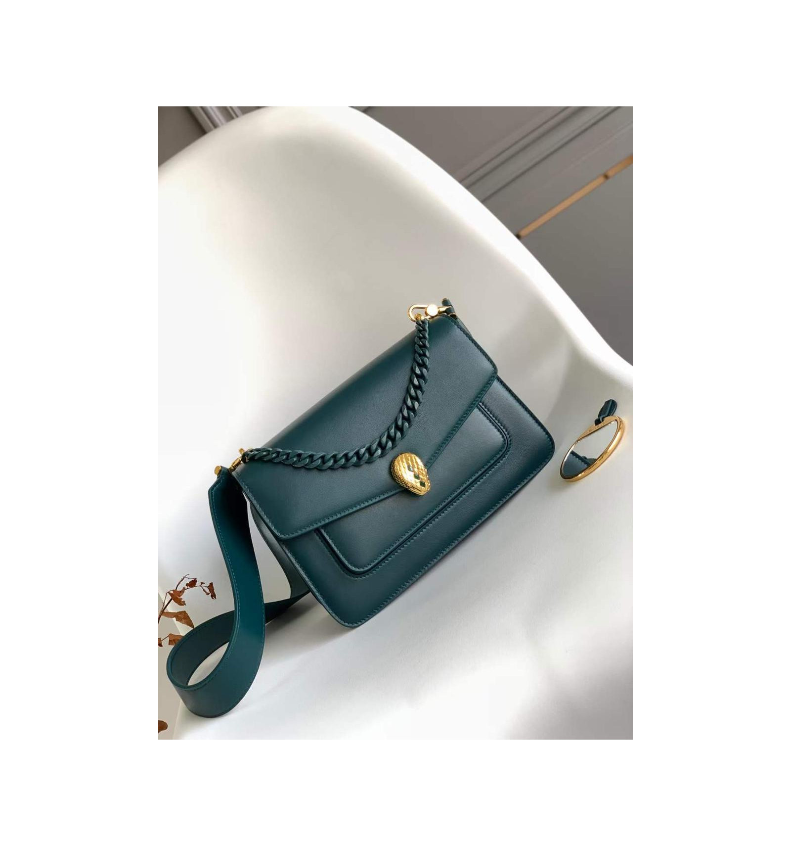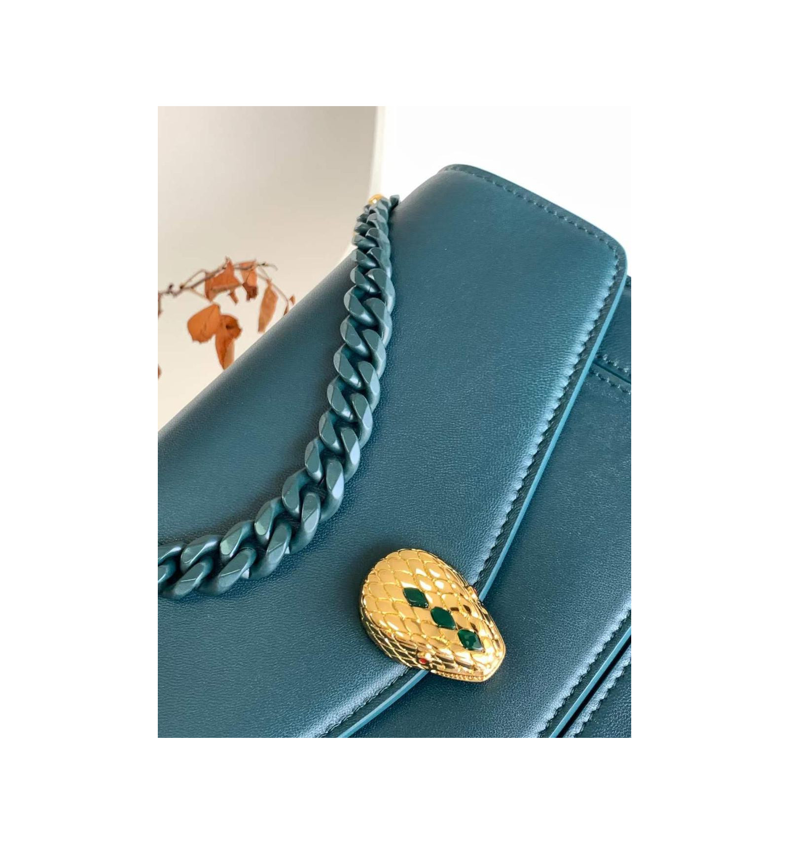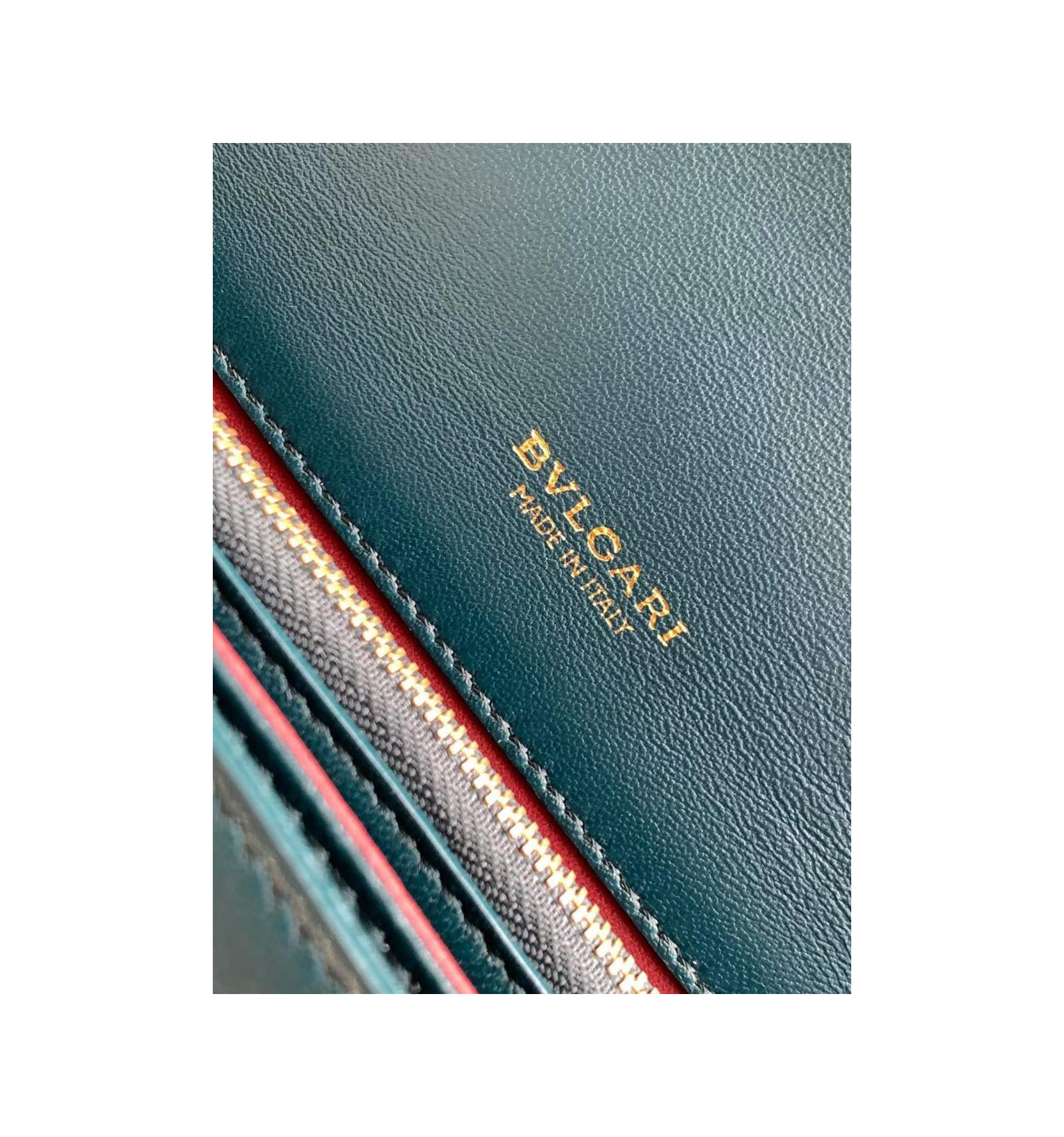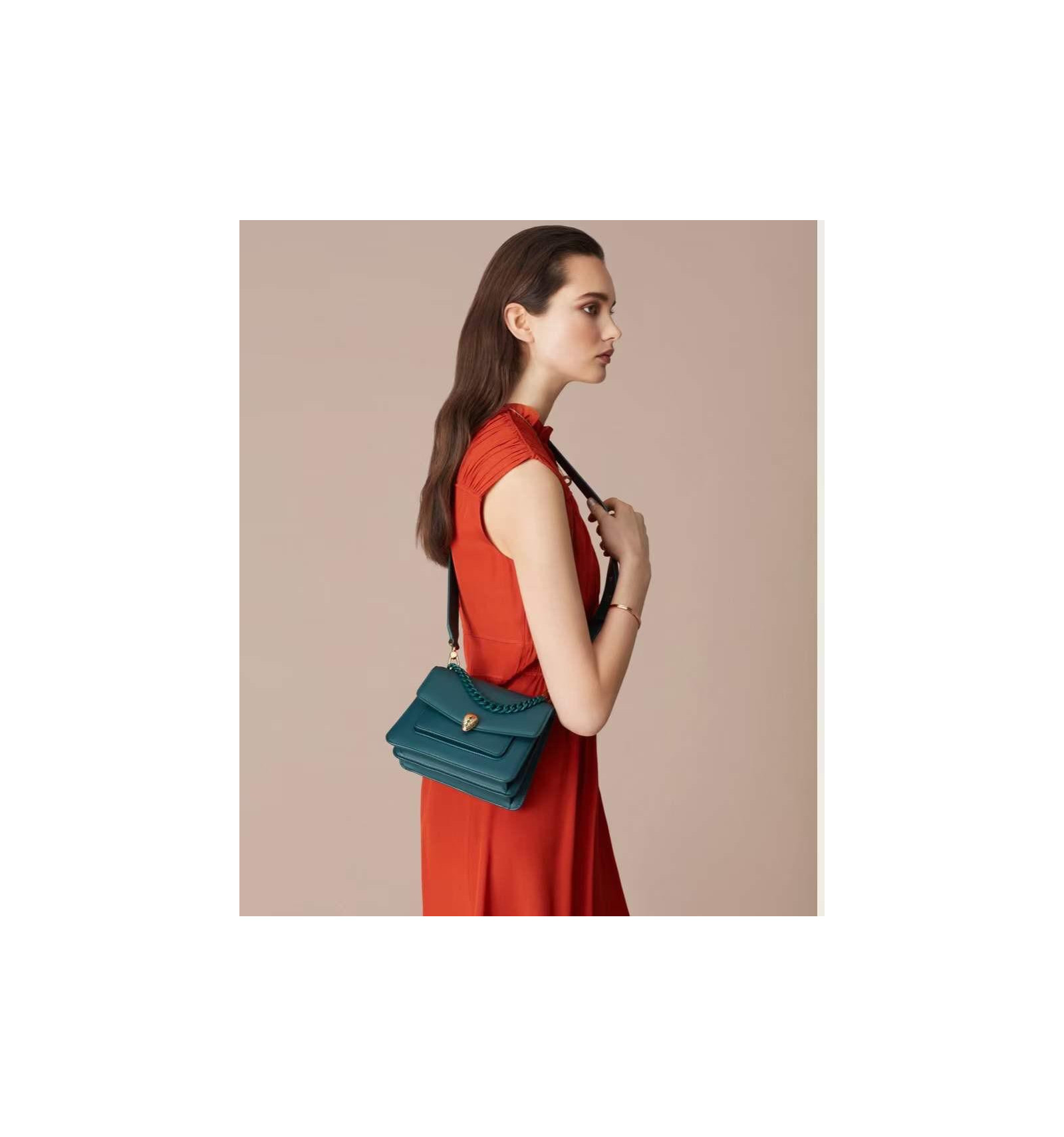 Serpenti Forever miniature bag with charm in azalea quartz green calf leather with beetroot spinel fuchsia calf leather interior. Captivating snakehead press stud closure in light gold-plated brass, embellished with green and white agate enamel scales and black enamel eyes.