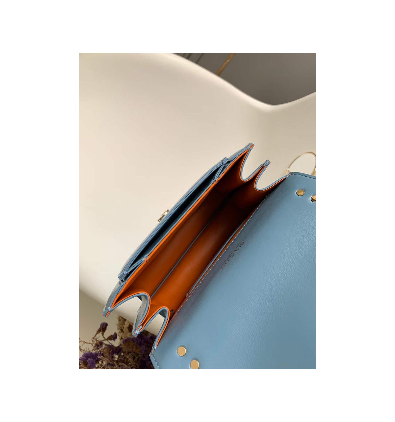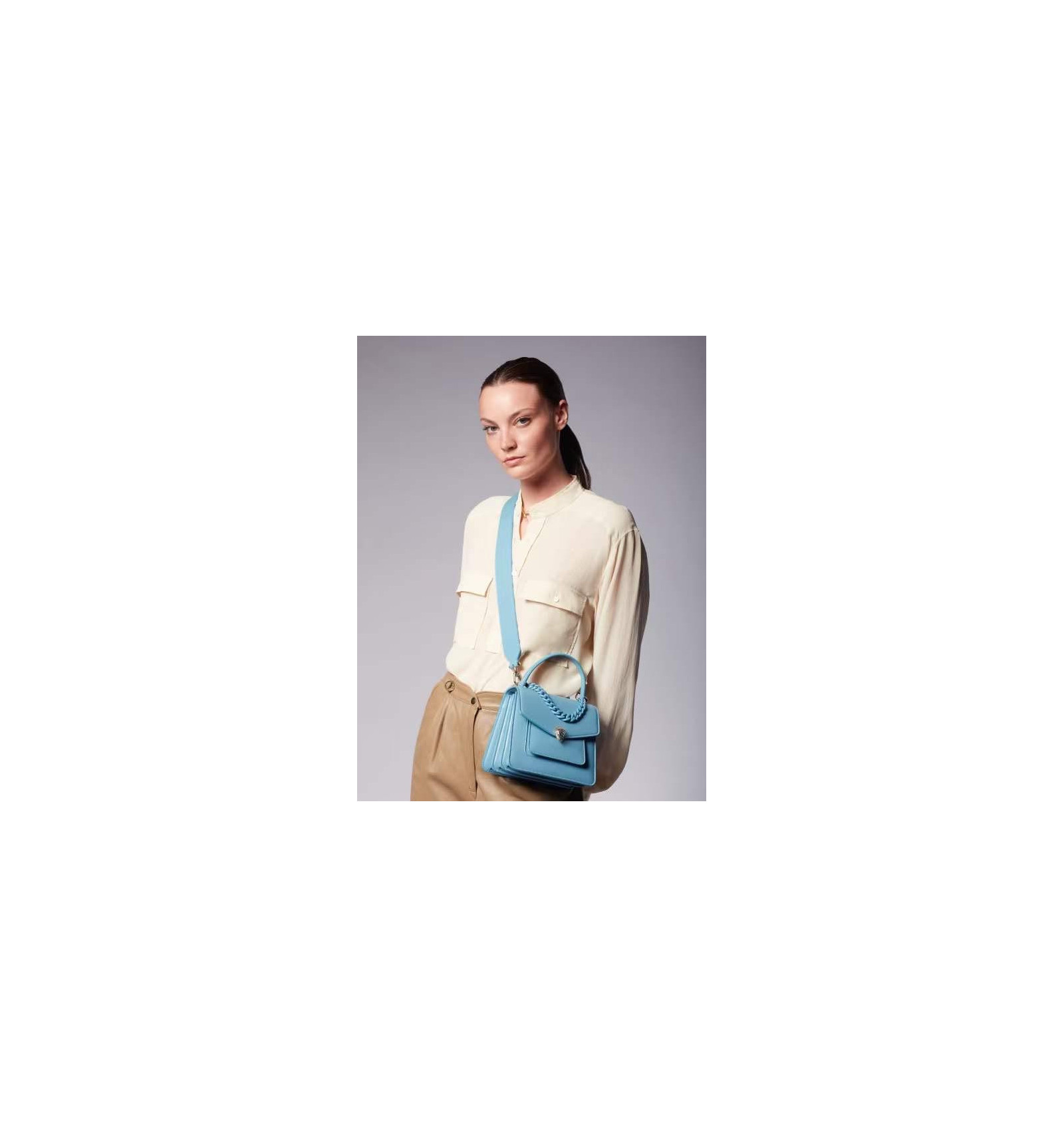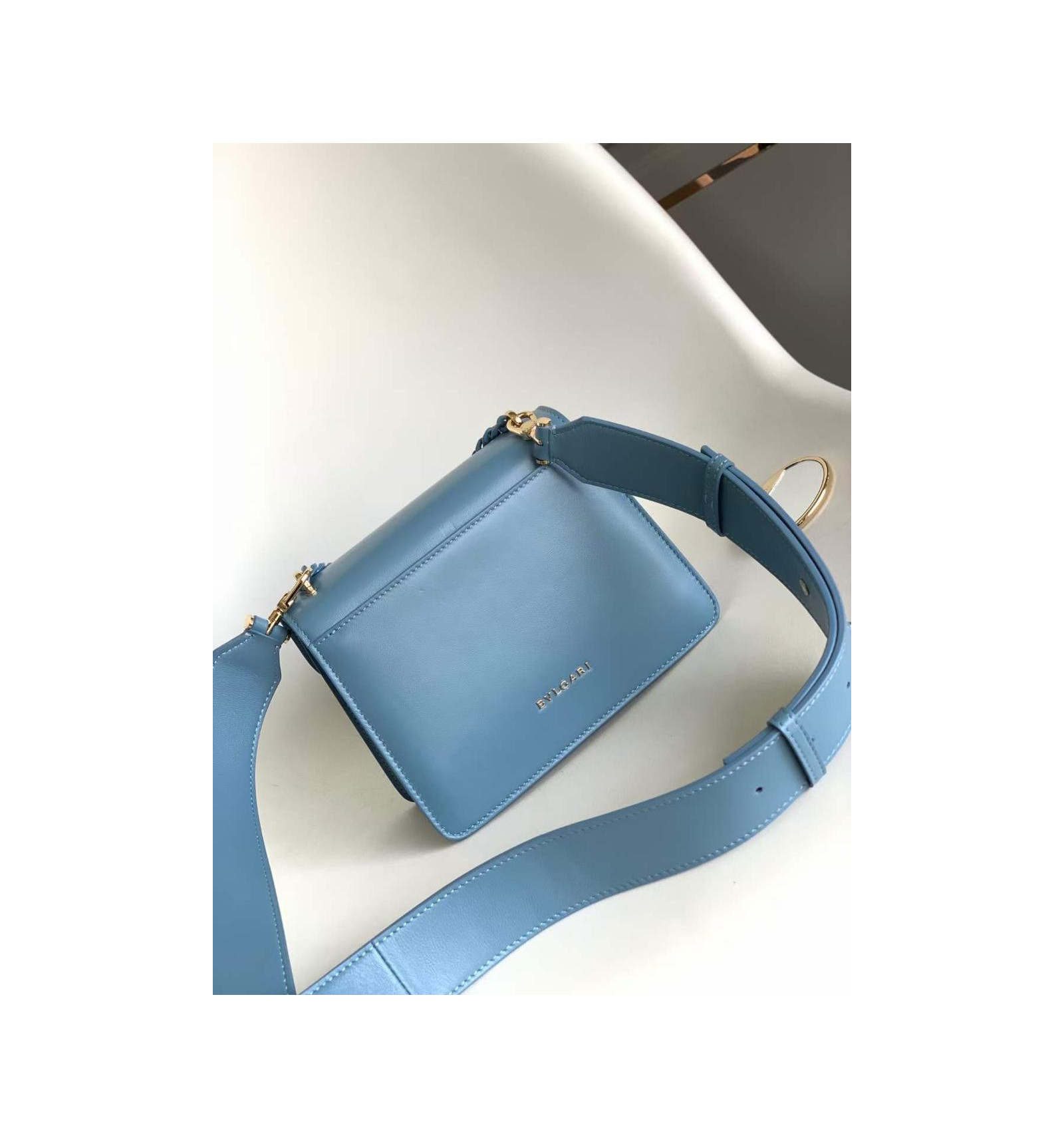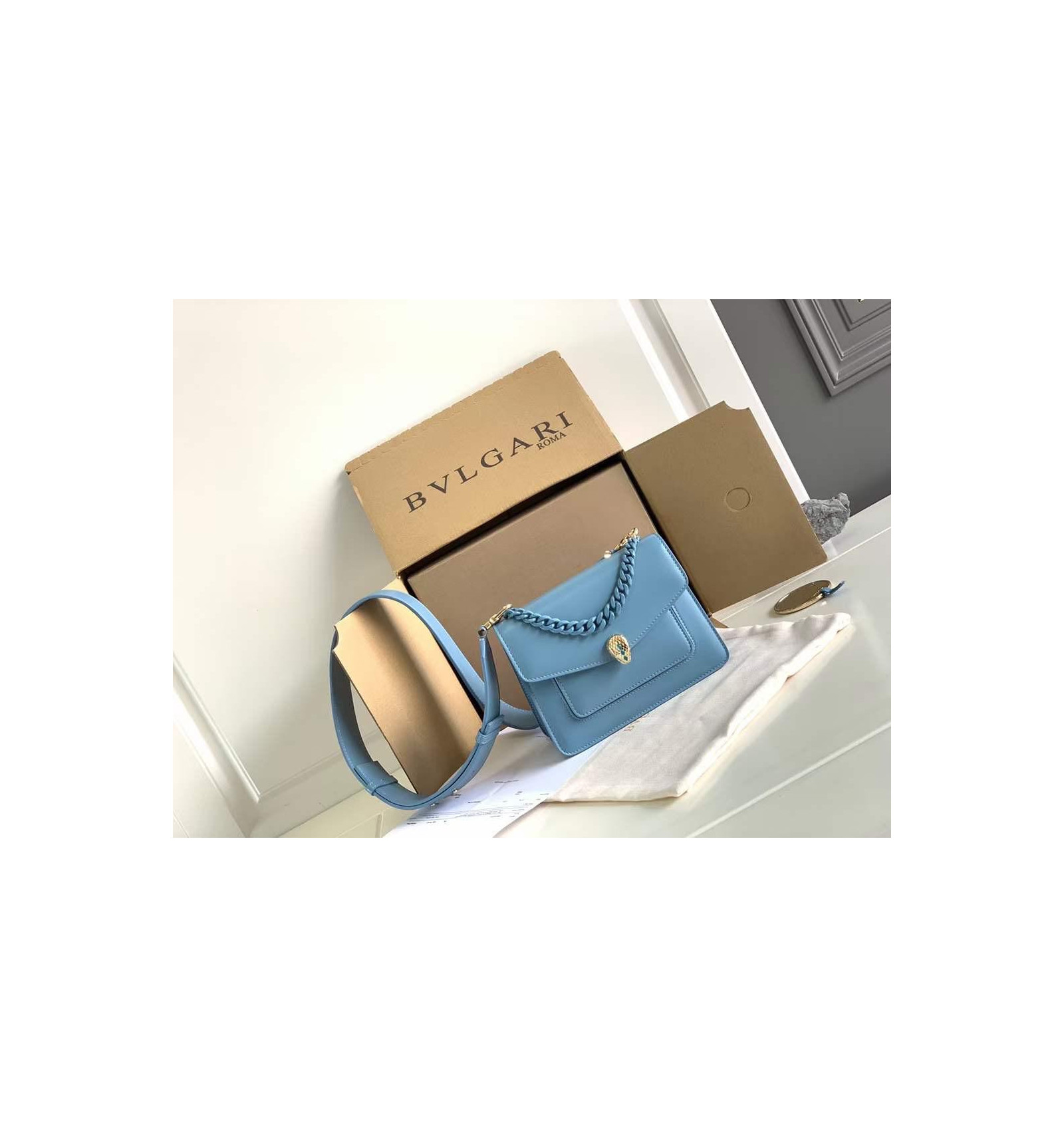 Serpenti Forever miniature bag with charm in azalea quartz light bleu calf leather with beetroot spinel fuchsia calf leather interior. Captivating snakehead press stud closure in light gold-plated brass, embellished with bleu and white agate enamel scales and black enamel eyes.