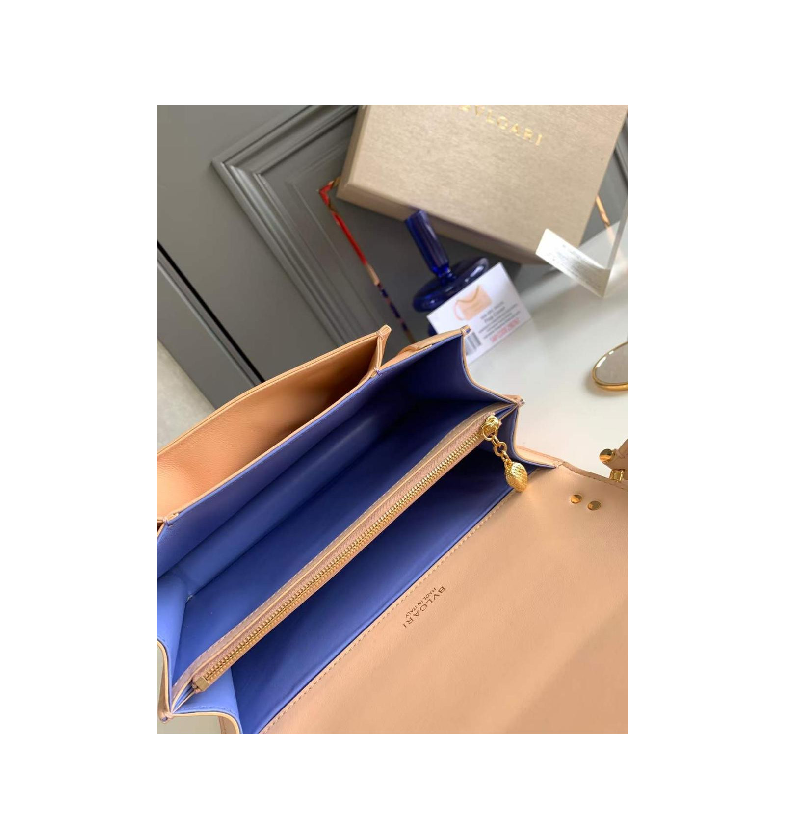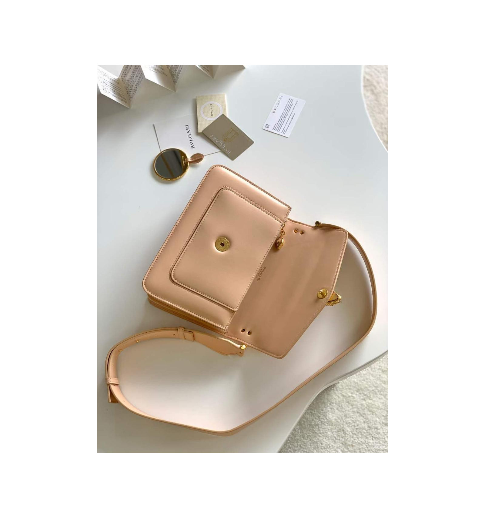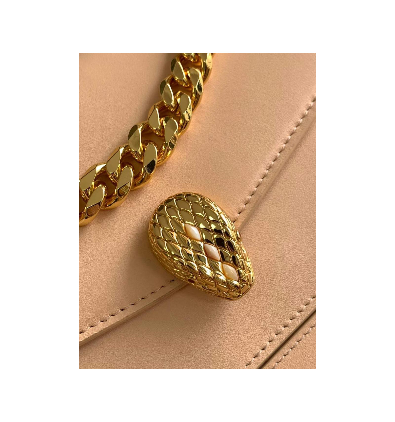 Serpenti Forever miniature bag with charm in azalea quartz beige calf leather with beetroot spinel fuchsia calf leather interior. Captivating snakehead press stud closure in light gold-plated brass, embellished with beige and white agate enamel scales and black enamel eyes.