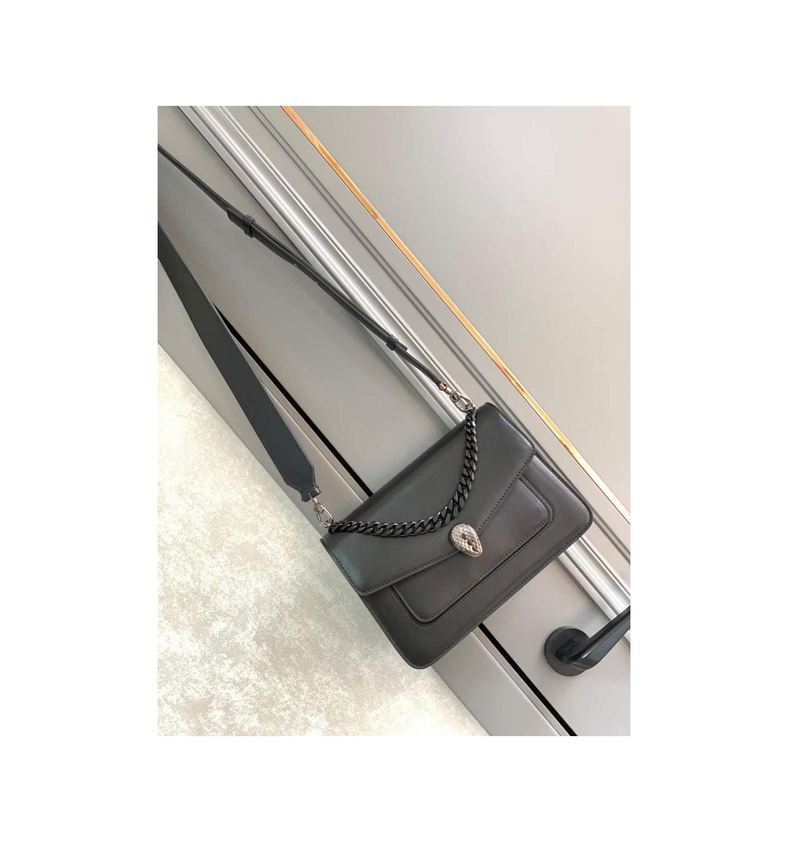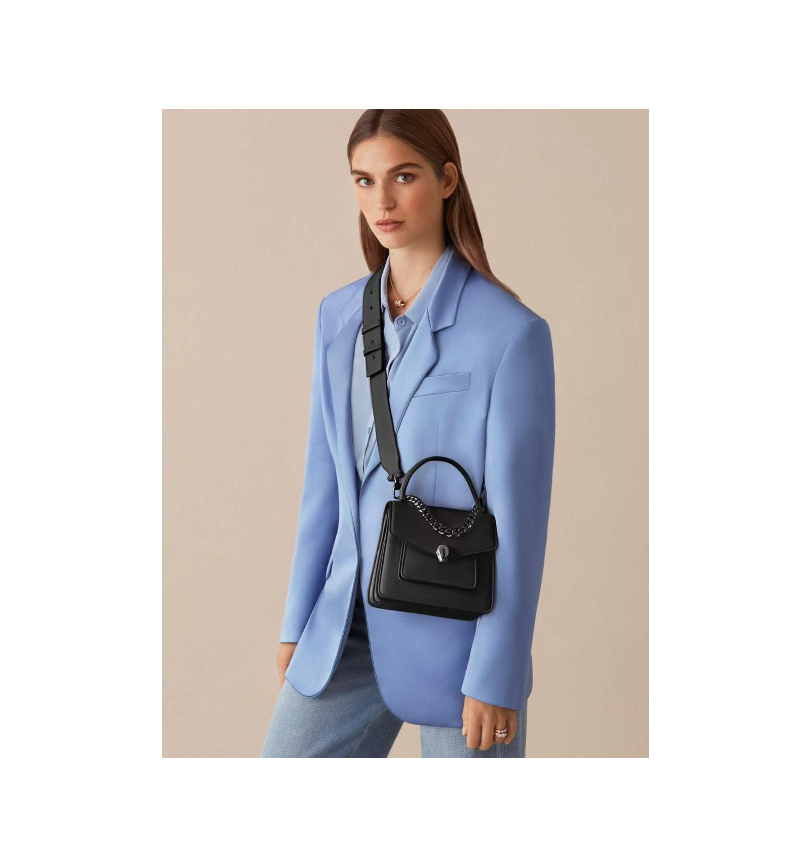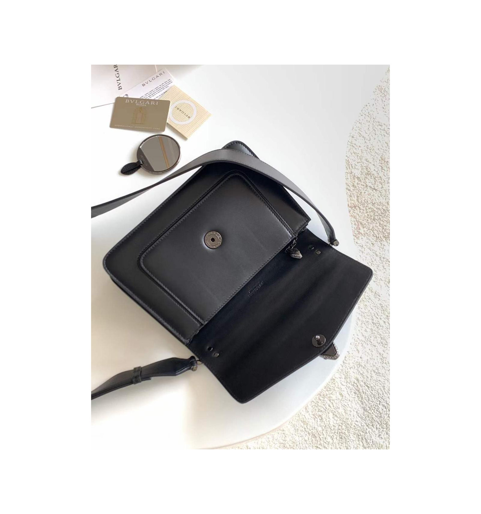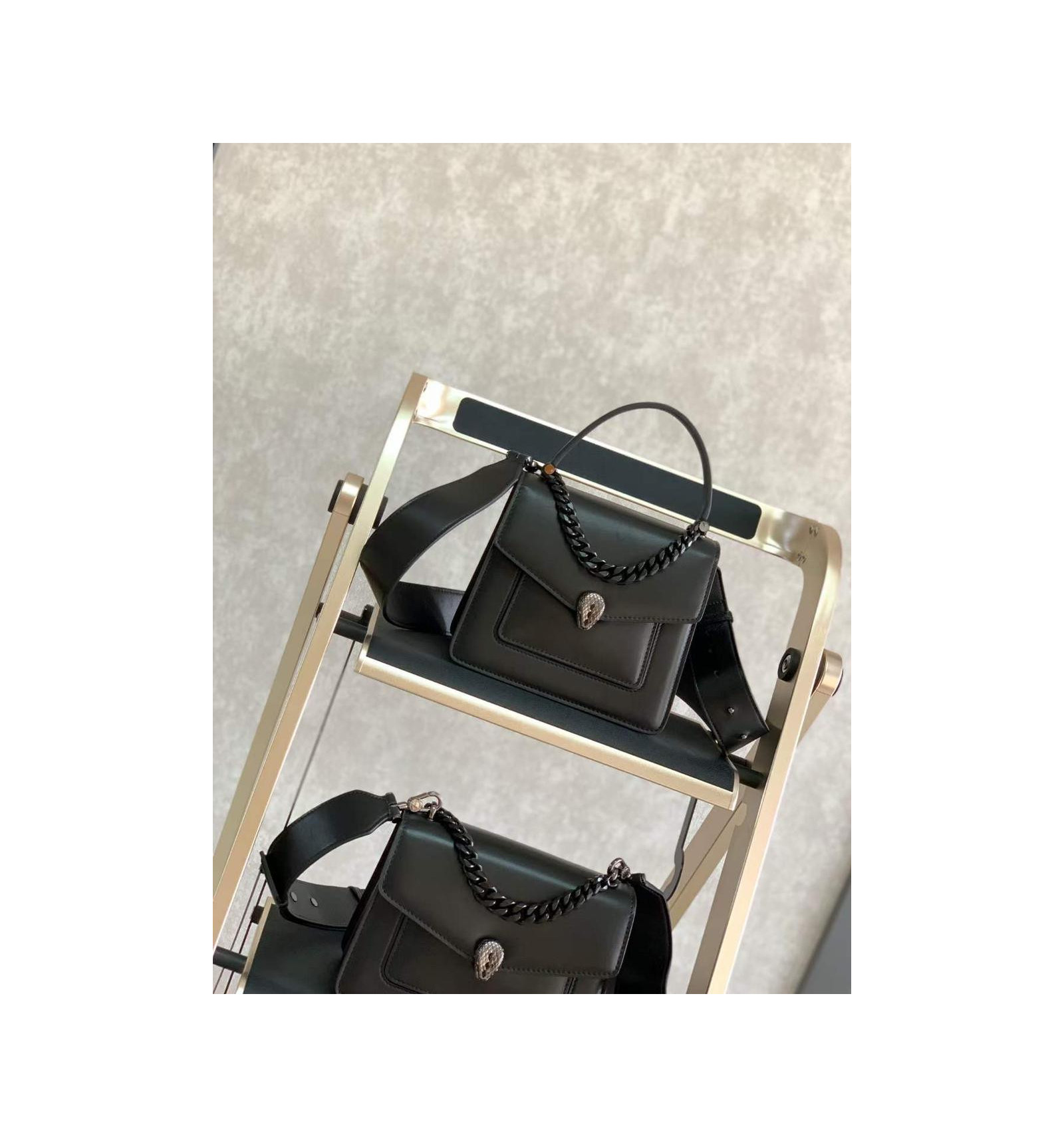 Serpenti Forever miniature bag with charm in azalea quartz black calf leather with beetroot spinel fuchsia calf leather interior. Captivating snakehead press stud closure in light gold-plated brass, embellished with black and white agate enamel scales and black enamel eyes.