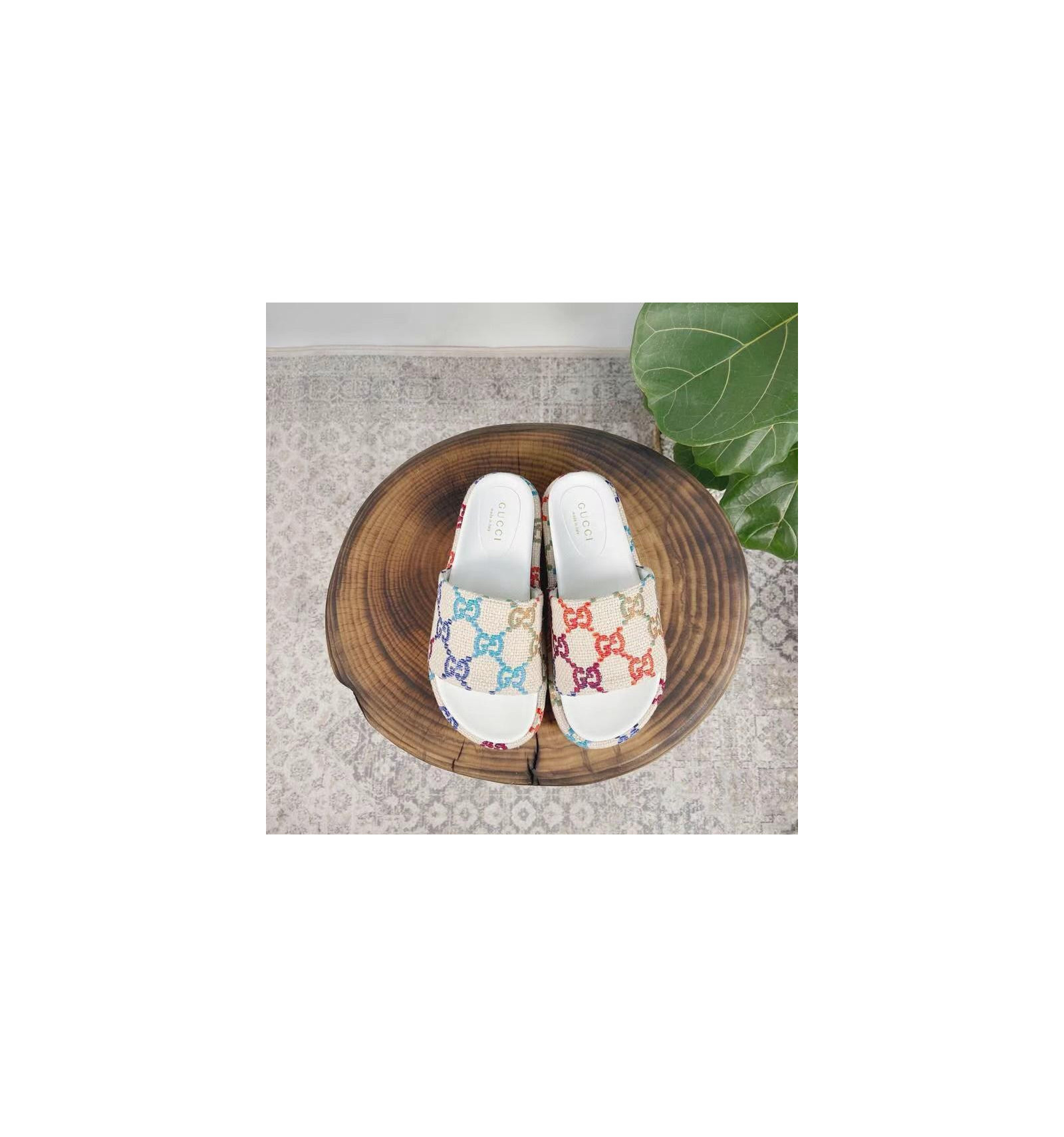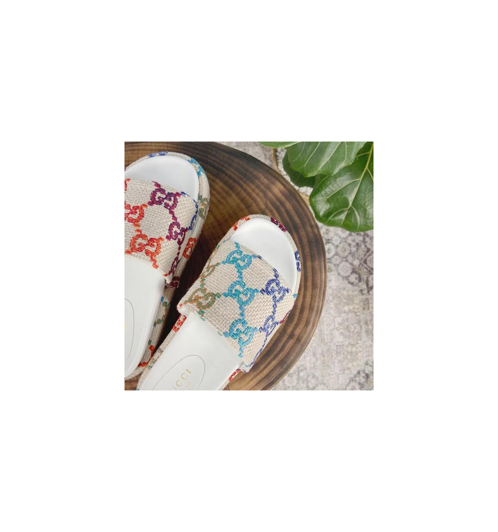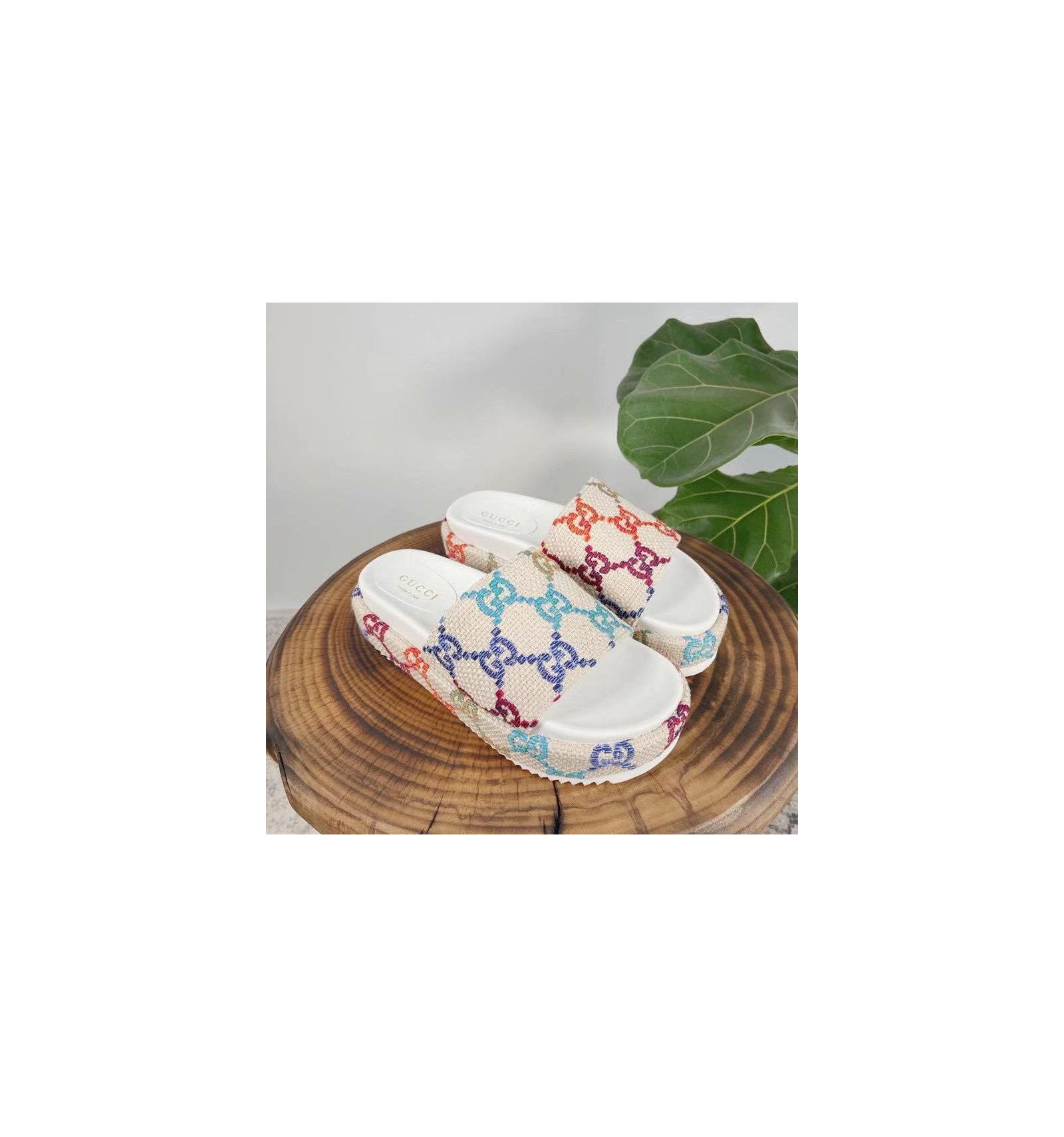 These slides are made from colorful GG monogrammed canvas with wide straps. They're set atop covered platform soles and have comfortable ergonomic footbeds.