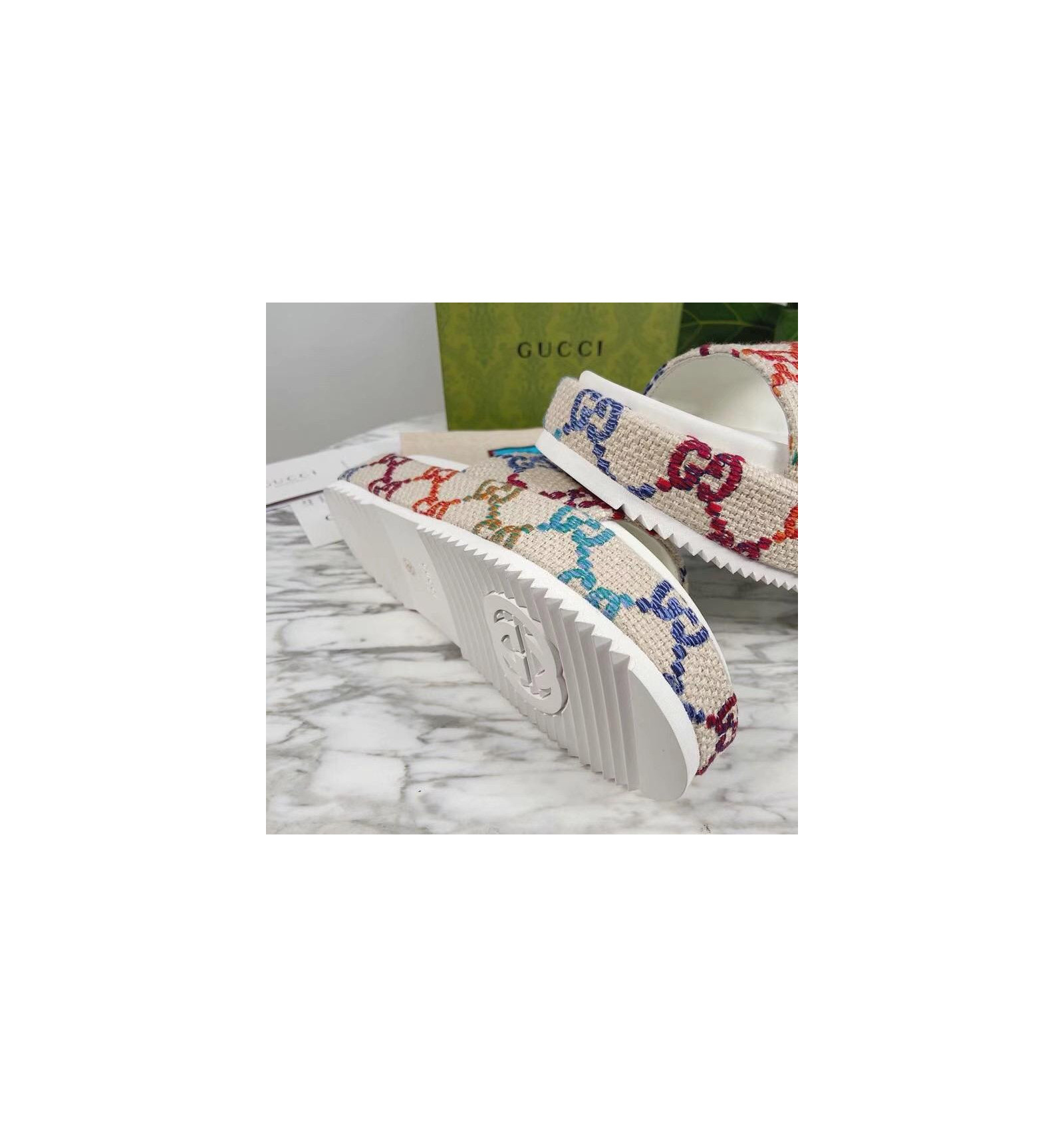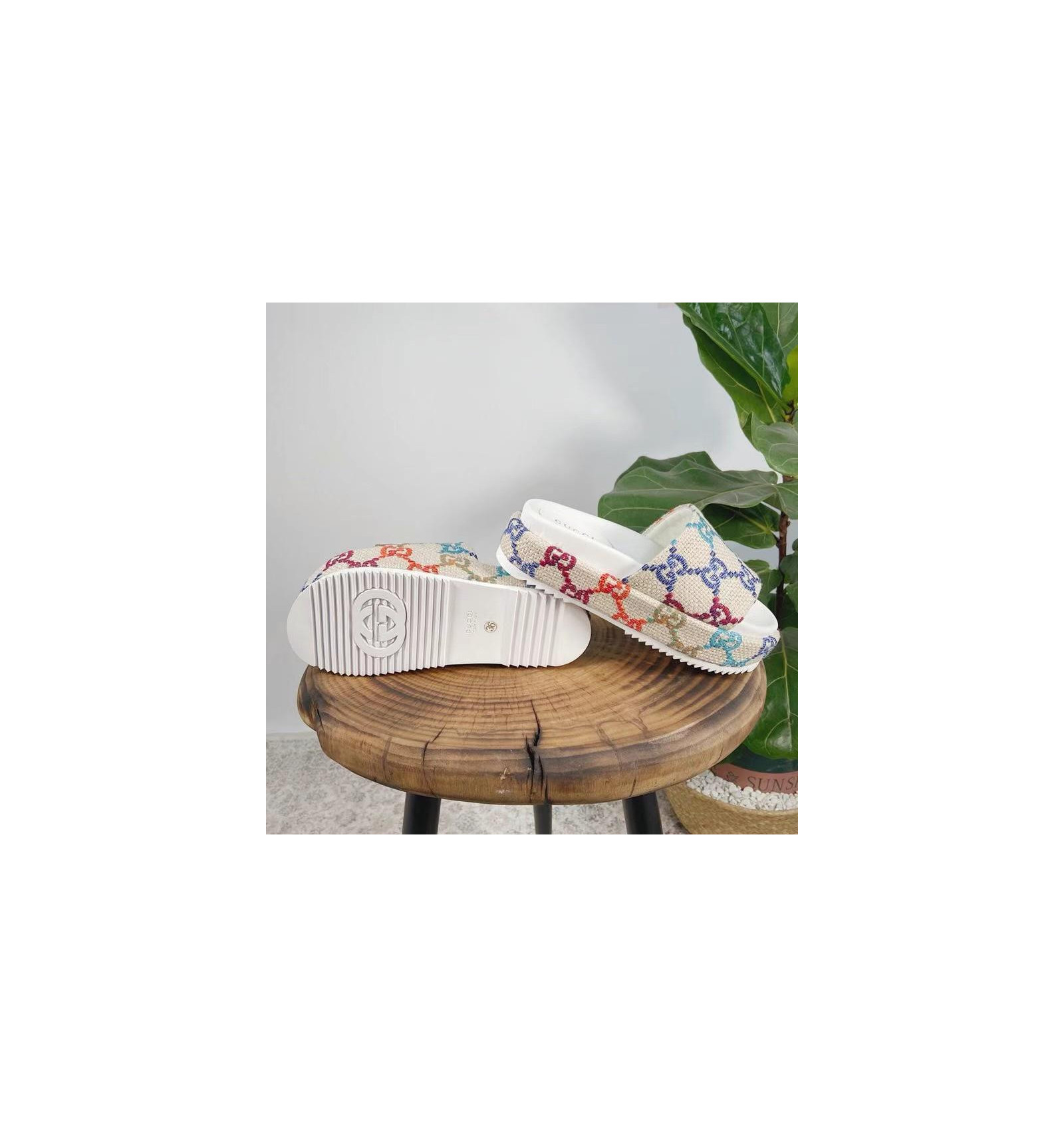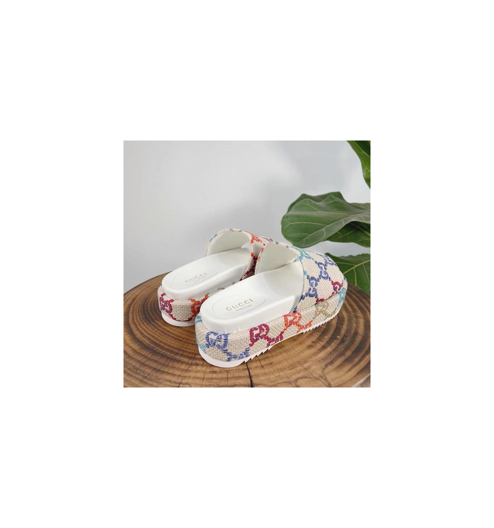 These slides are made from colorful GG monogrammed canvas with wide straps. They're set atop covered platform soles and have comfortable ergonomic footbeds.
