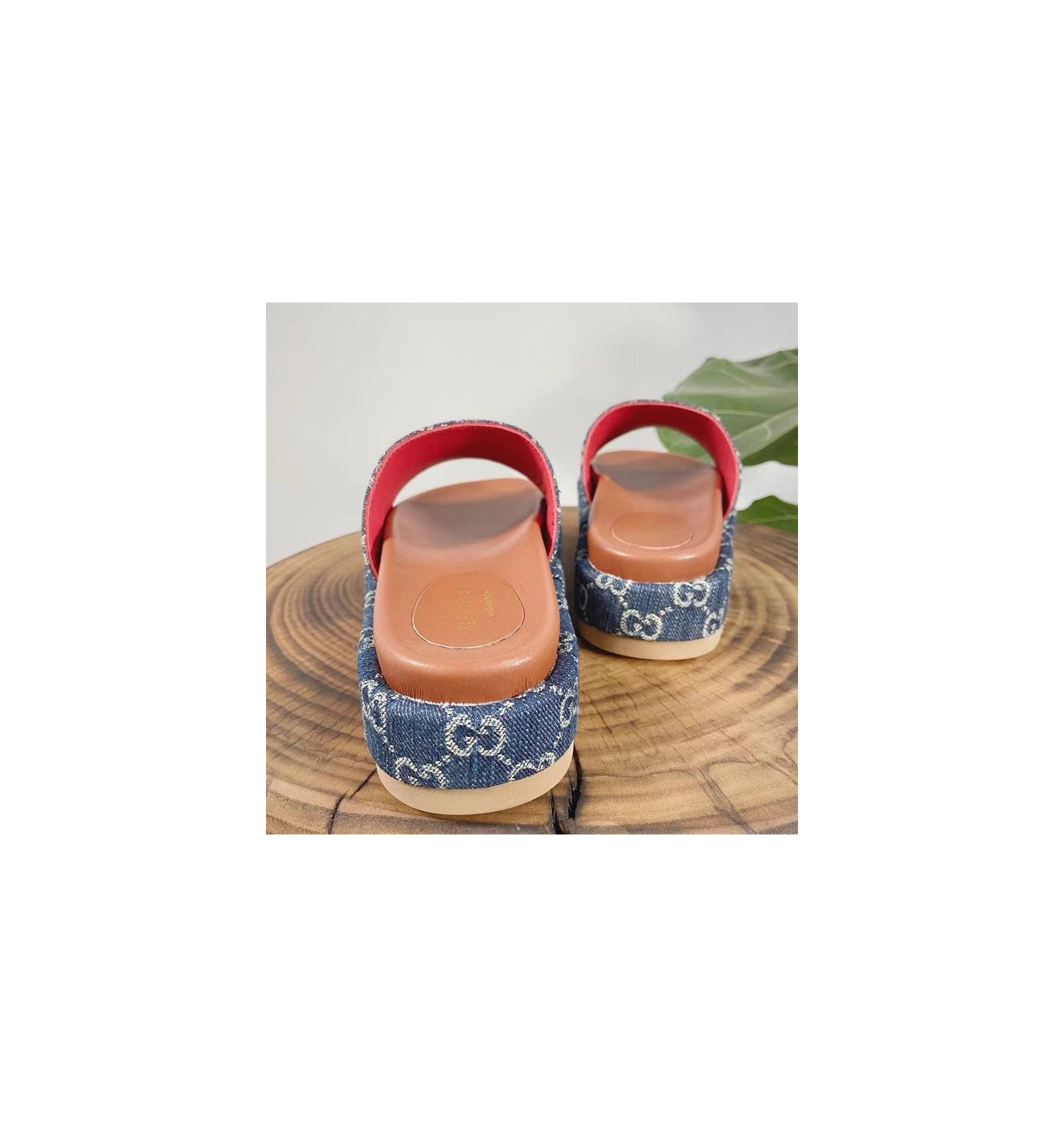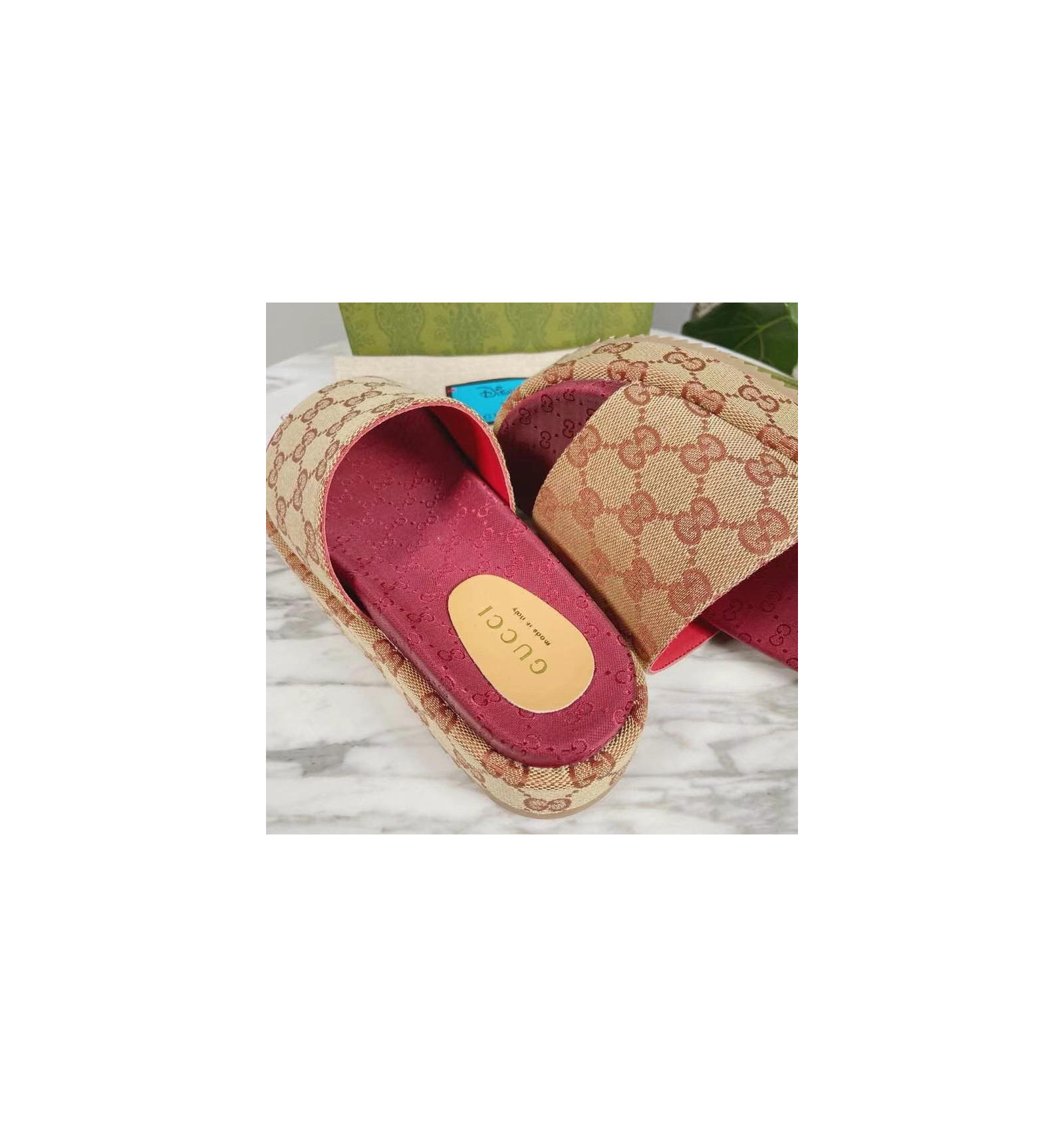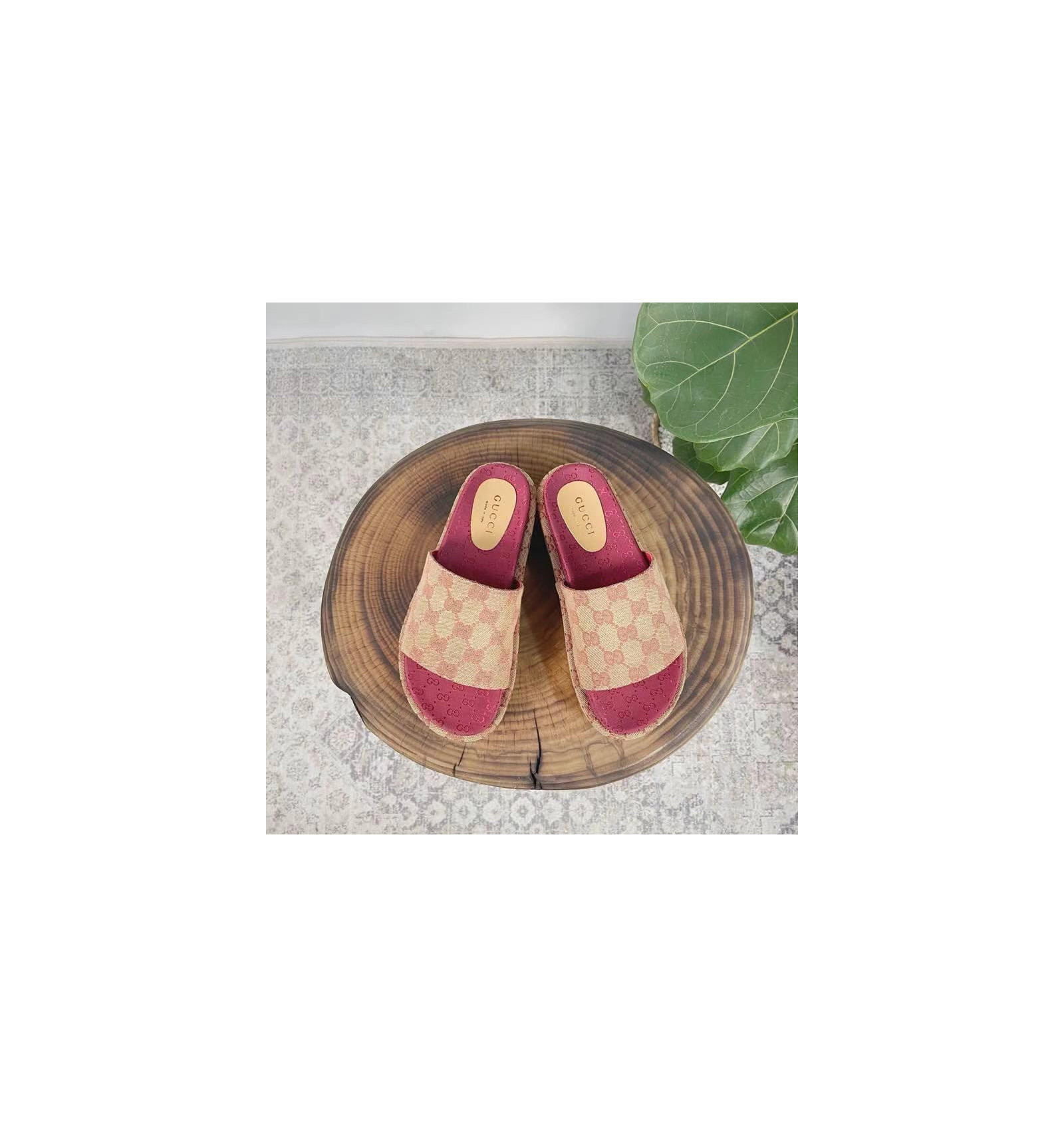 The House's archival monogram canvas fabric is reimagined as a men's slide sandal with the GG motif in a maxi size and trimmed with brown leather. The molded footbed is completed with a rubber lug sole.