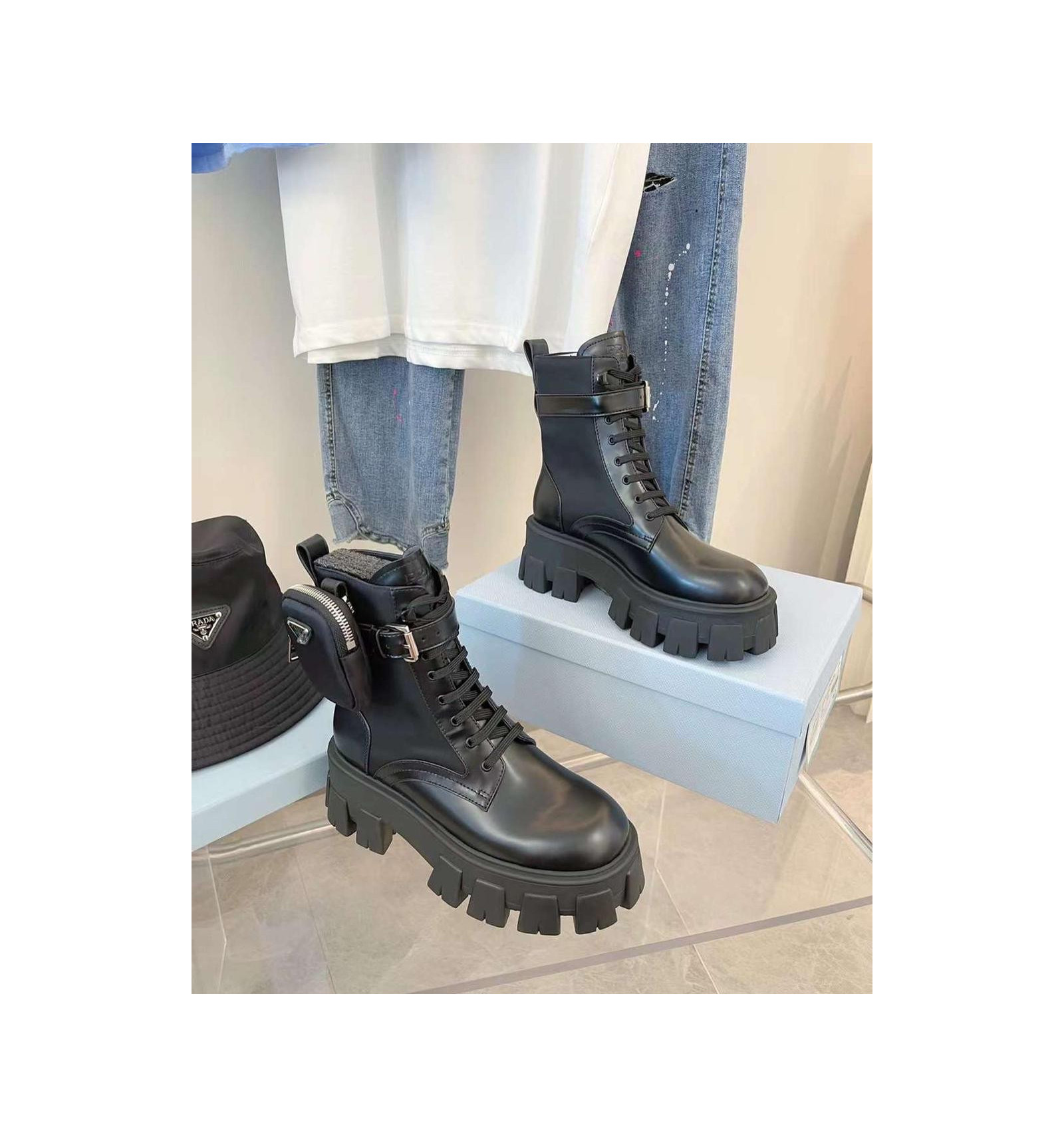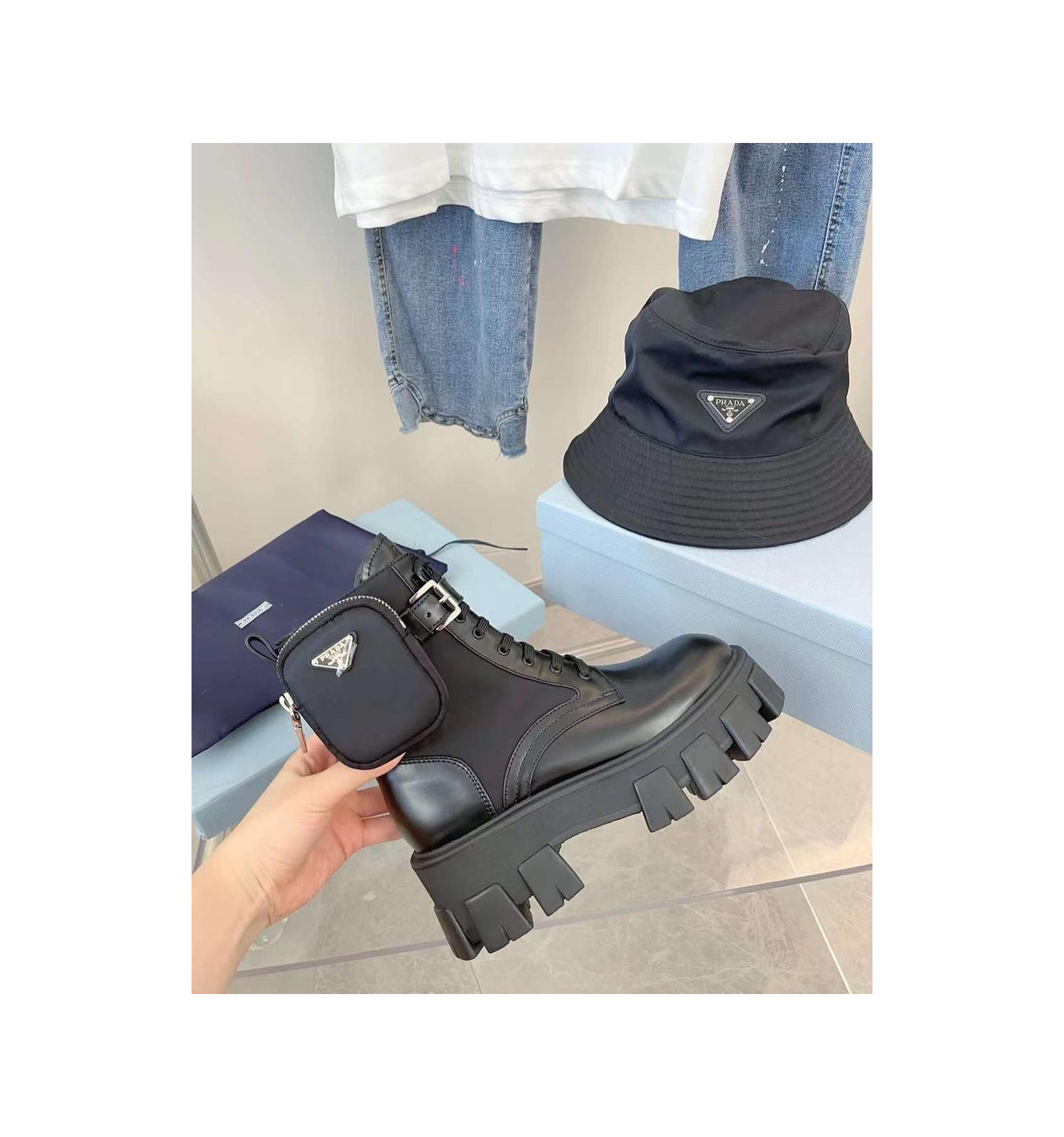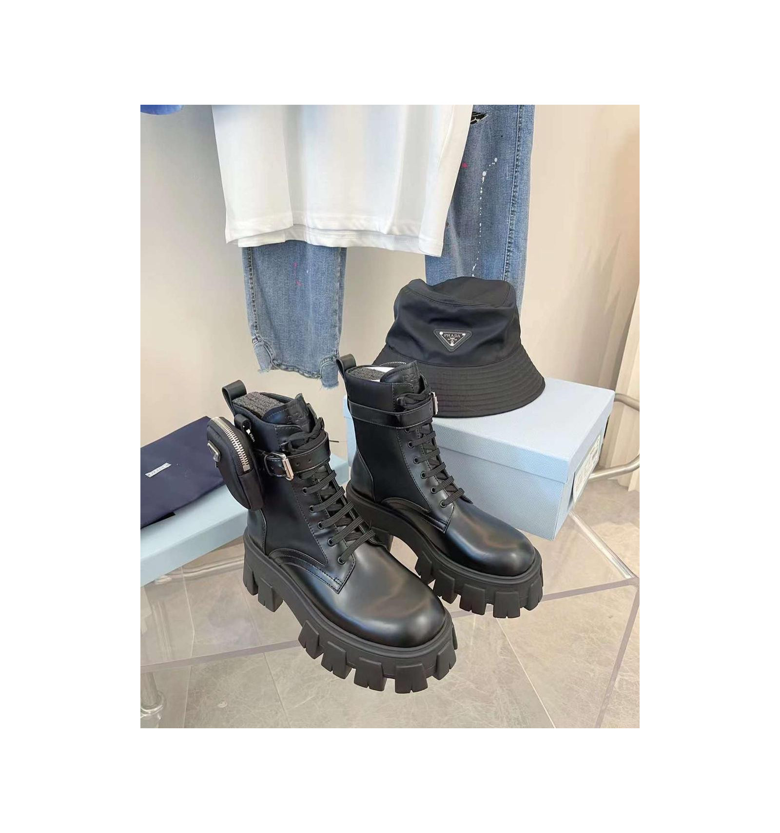 These brushed leather and nylon boots are decorated with a versatile pouch that recalls a multi-pocket design.