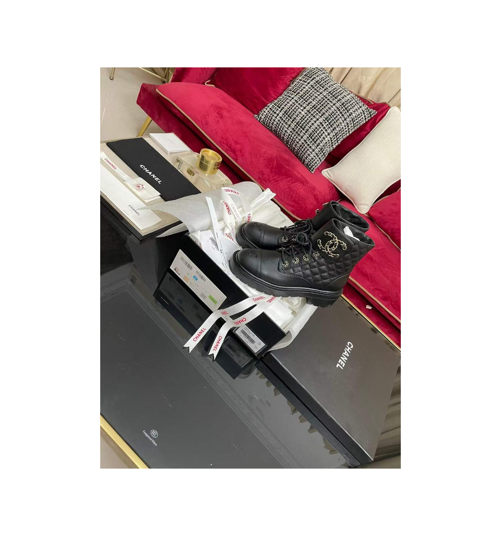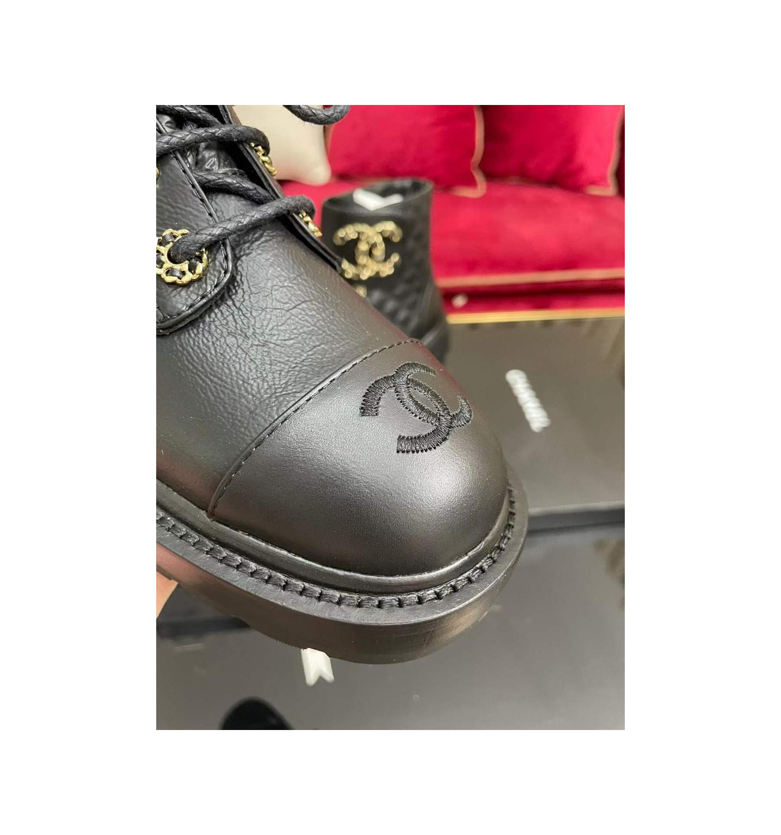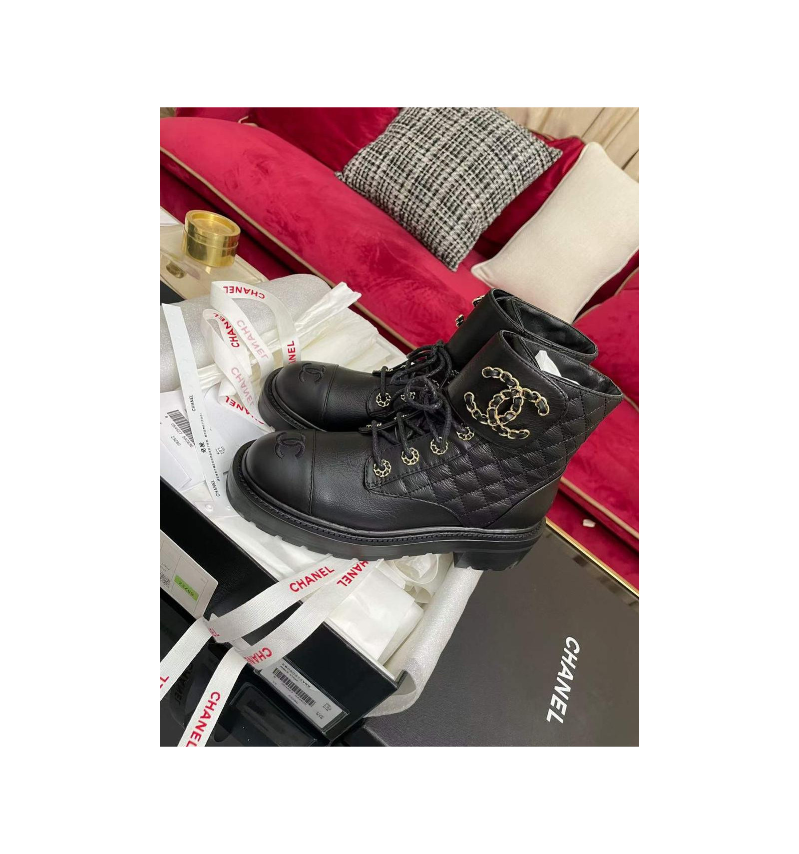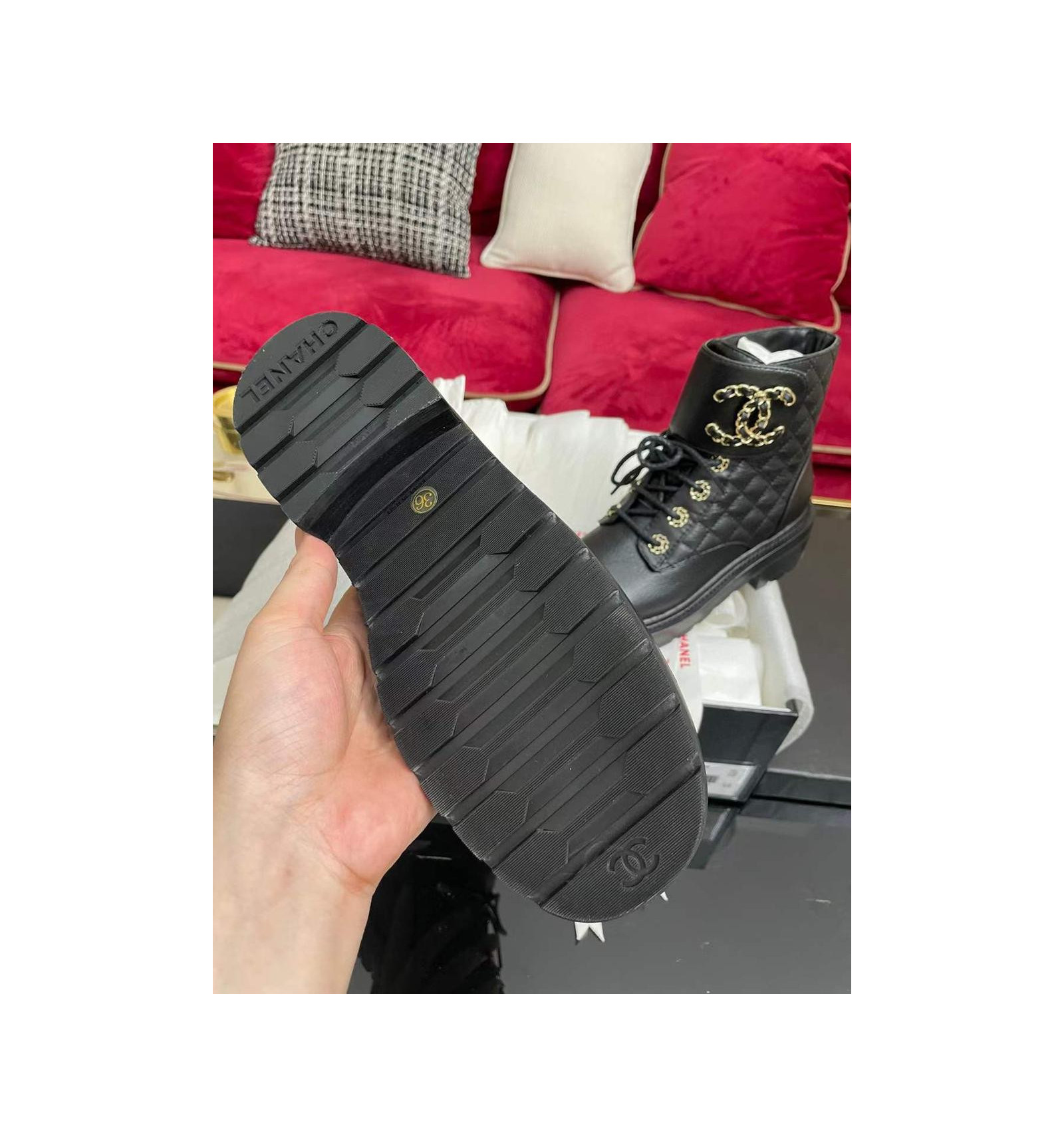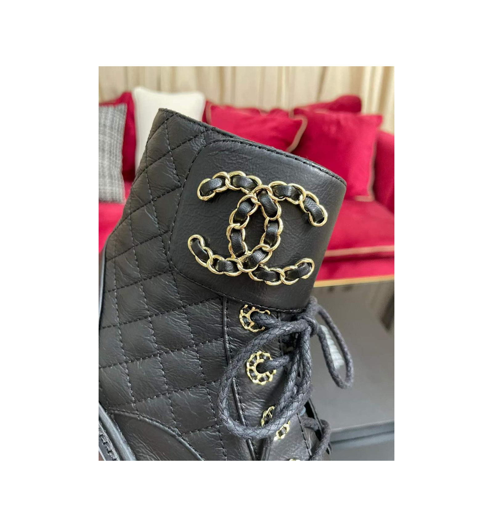 Stacked with signature details and loaded with luxury, these combat boots from Chanel serve as a timeless design for your collection. These CC boots feature black quilted leather on the exterior with a chain-link logo embellishment and lace-up detail accentuating the vamps. Obtain a luxe-athleisure look as you wear these boots.